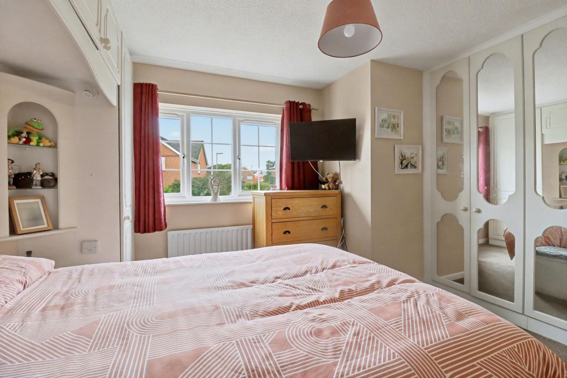 The good-sized master bedroom faces the front of the property and has a range of fitted wardrobes and storage, as well as a modern en-suite with a shower cubicle, vanity wash hand basin, heated towel rail, WC and a window to the side.
