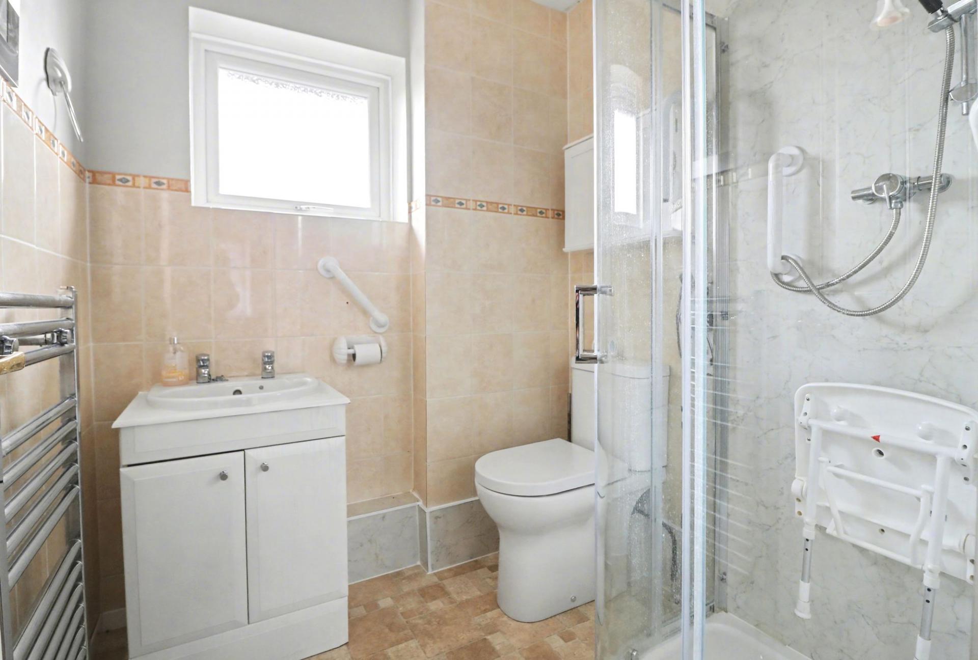 The shower room has a window to the front and comprises a corner shower cubicle, vanity wash hand basin, WC and a heated towel rail.
