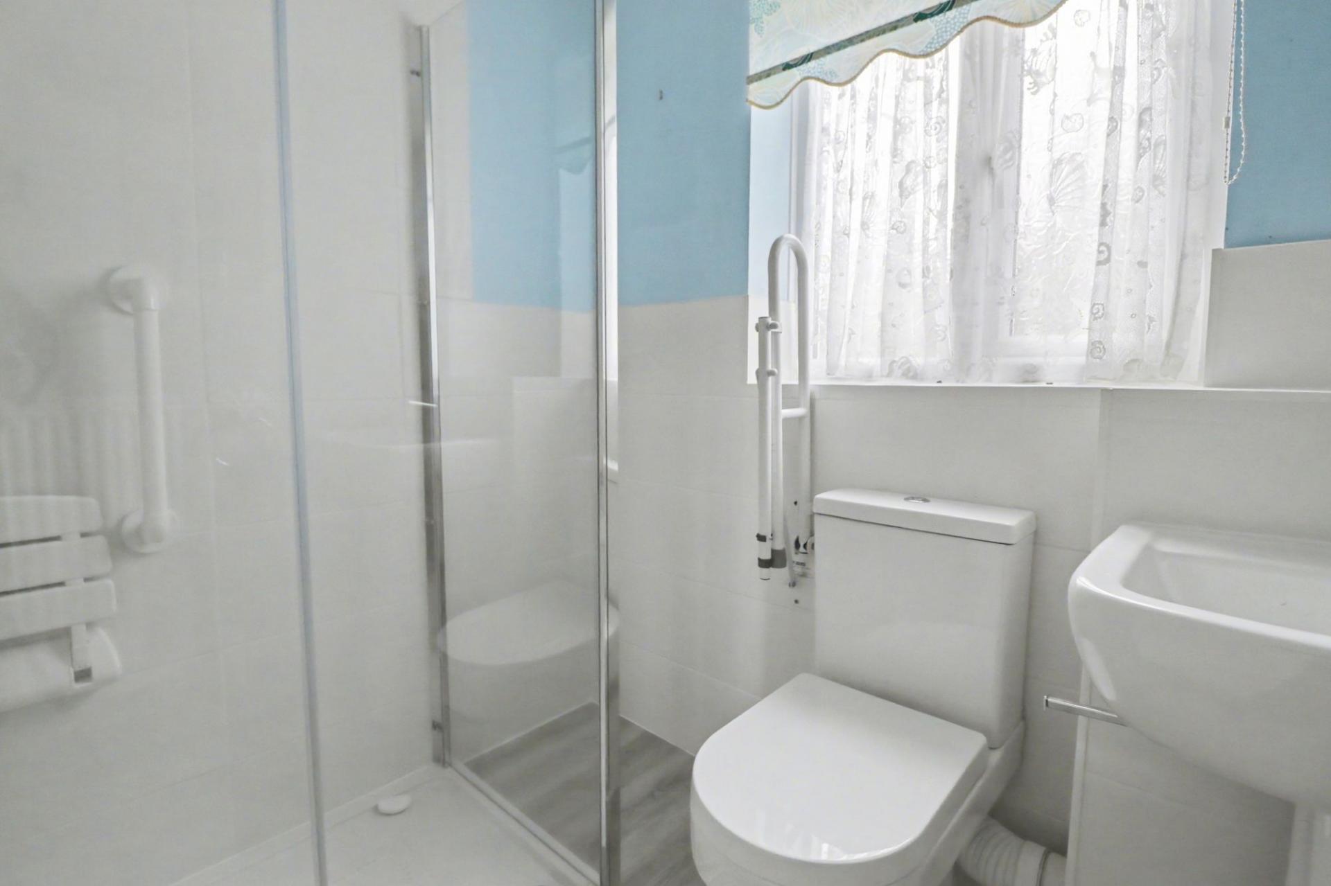 The modern shower room comprises a wash hand basin, WC, shower cubicle and a window to the rear.
