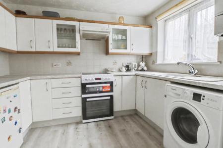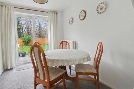 The dining room has a built-in storage cupboard, sliding doors leading out to the rear garden and an opening to the kitchen, which has a window to the rear. The kitchen has been fitted with a matching range of wall and base units with space for free-standing appliances.