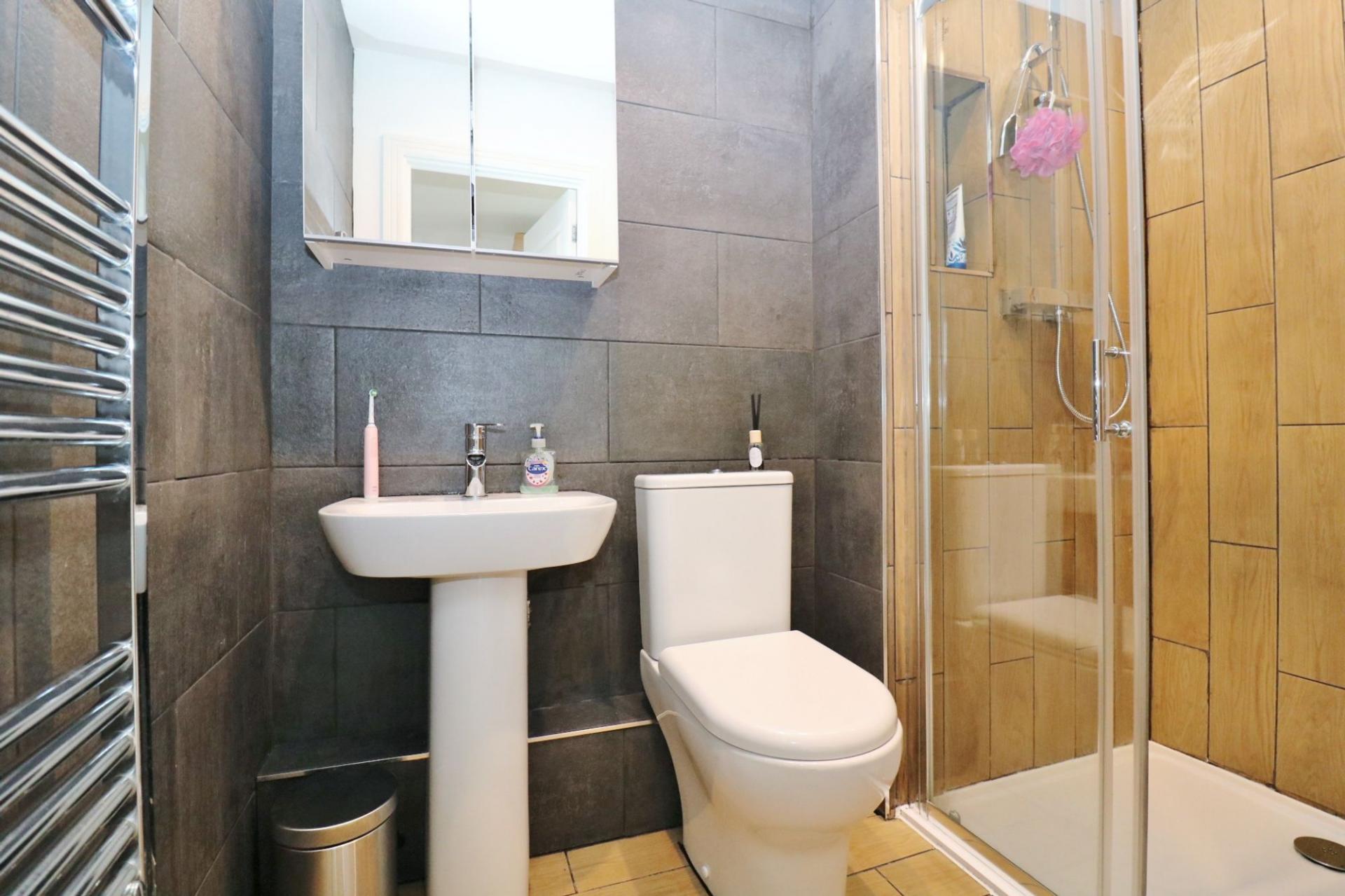 The top floor offers two further double bedrooms with windows to the front and side, as well as a modern shower room with a shower cubicle, wash hand basin and WC.