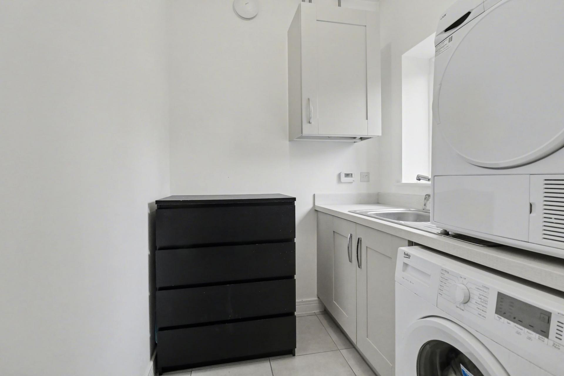 The adjoining utility room has a window to the rear and offers further units with space for a washing machine and tumble dryer.