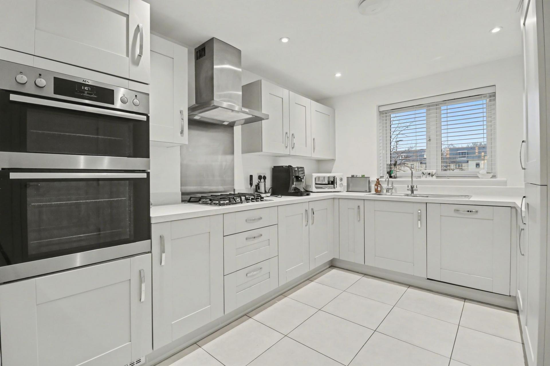 The impressive, 26ft kitchen/diner enjoys a dual aspect with a part-vaulted ceiling to the dining area with a skylight window and French doors leading out to the rear garden. The kitchen has been fitted with a beautiful range of shaker style units with a built-in double oven and gas hob with extractor over, as well as an integrated dishwasher and space for an American style fridge/freezer.