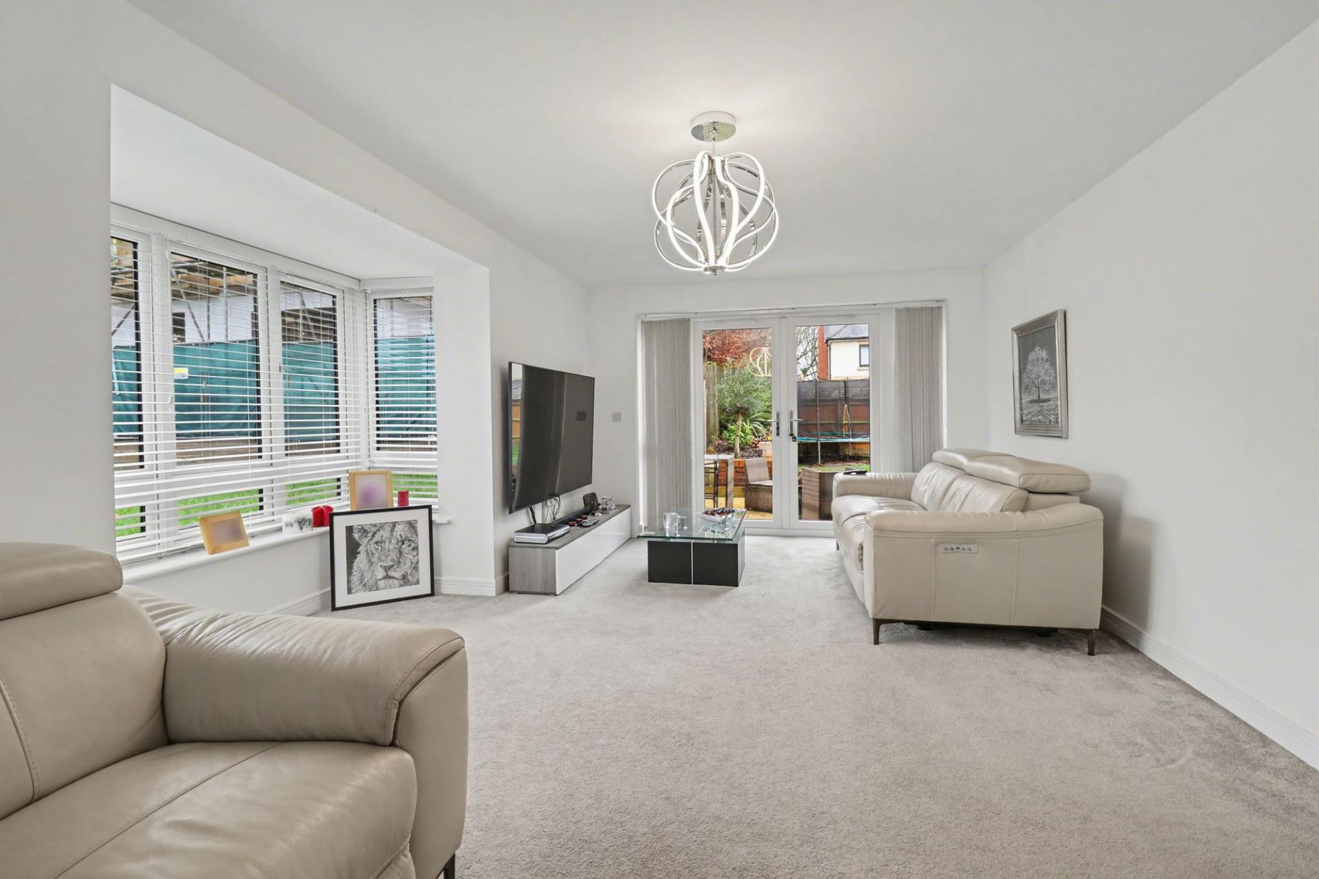 The beautifully decorated lounge is a light and spacious, triple aspect room with a large bay window to the side and French doors to the rear garden.