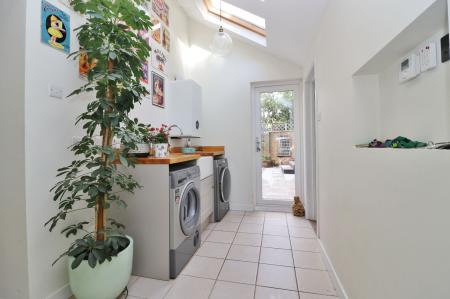 The entrance hall leads through to the utility area, which has skylight windows, a Butler style sink, space for a washing machine and tumble dryer, as well as a door leading out to the rear garden.