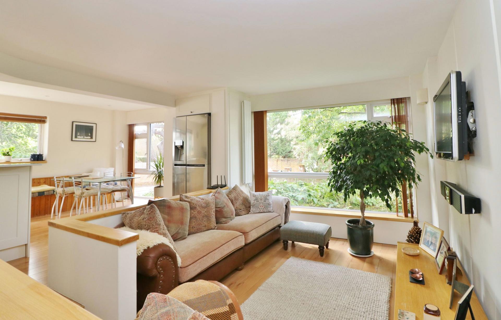 The generous kitchen/dining/living room offers a wonderful, open plan living space, with two large windows to the front and a window to the side. The kitchen has been fitted with a modern range of shaker style wall and base units with a Butler style sink, two built-in ovens, an electric hob with extractor over and an integrated dishwasher. To one side there is recess space for an American style fridge/freezer and steps leading down to a sunken seating area.