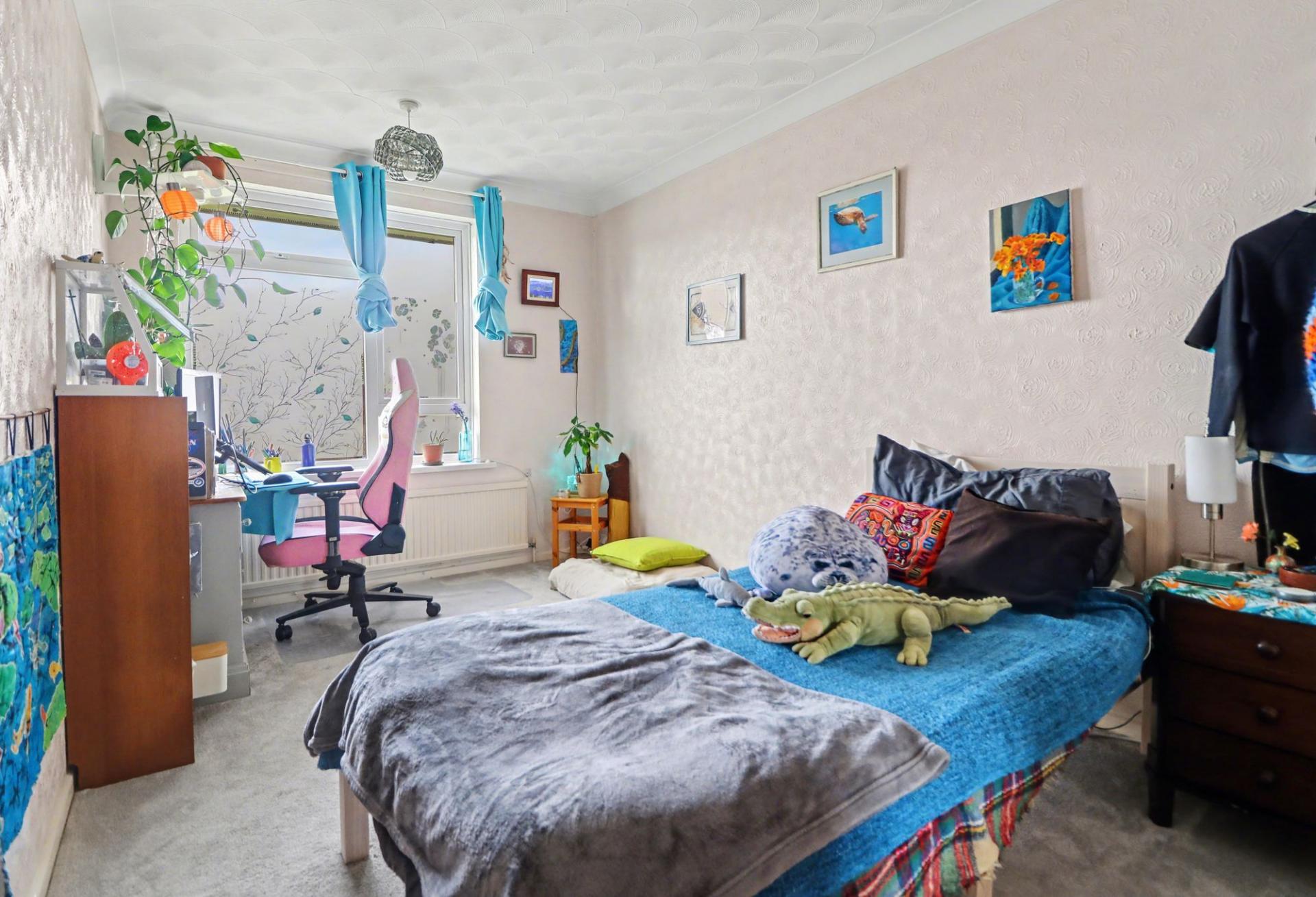 The double bedroom overlooks the front and benefits from a fitted wardrobe, with the bathroom comprising a panel enclosed bath with electric shower over, wash hand basin, WC and a window to the rear.