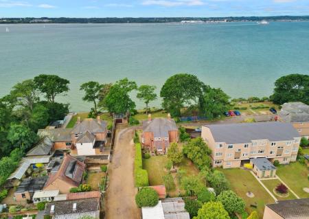 To the front, a gate leads through to the good sized, lawned garden which has mature tree borders and a path leading down to the beach and waterfront, providing direct access to the Solent.