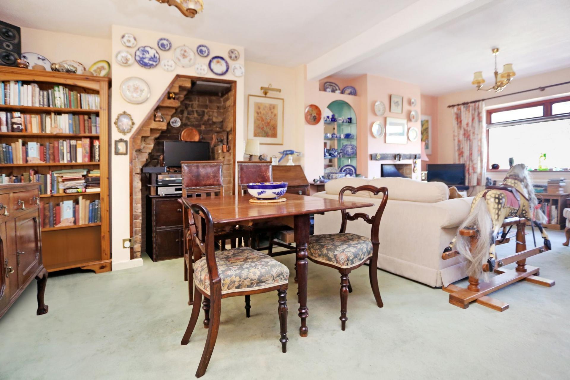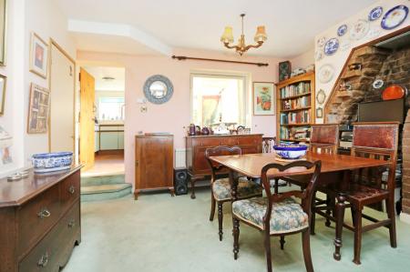 From the inviting entrance hall a door leads directly through to the sitting room, which is a lovely bright room with a window to the front, chimney breast with inset open fire and fitted shelving to either side. The room then opens out into a well-proportioned dining area, again a lovely bright room, which has an exposed brick fireplace to one side, a window through to the conservatory/day room, along with a turned staircase to one side leading up to the first floor.