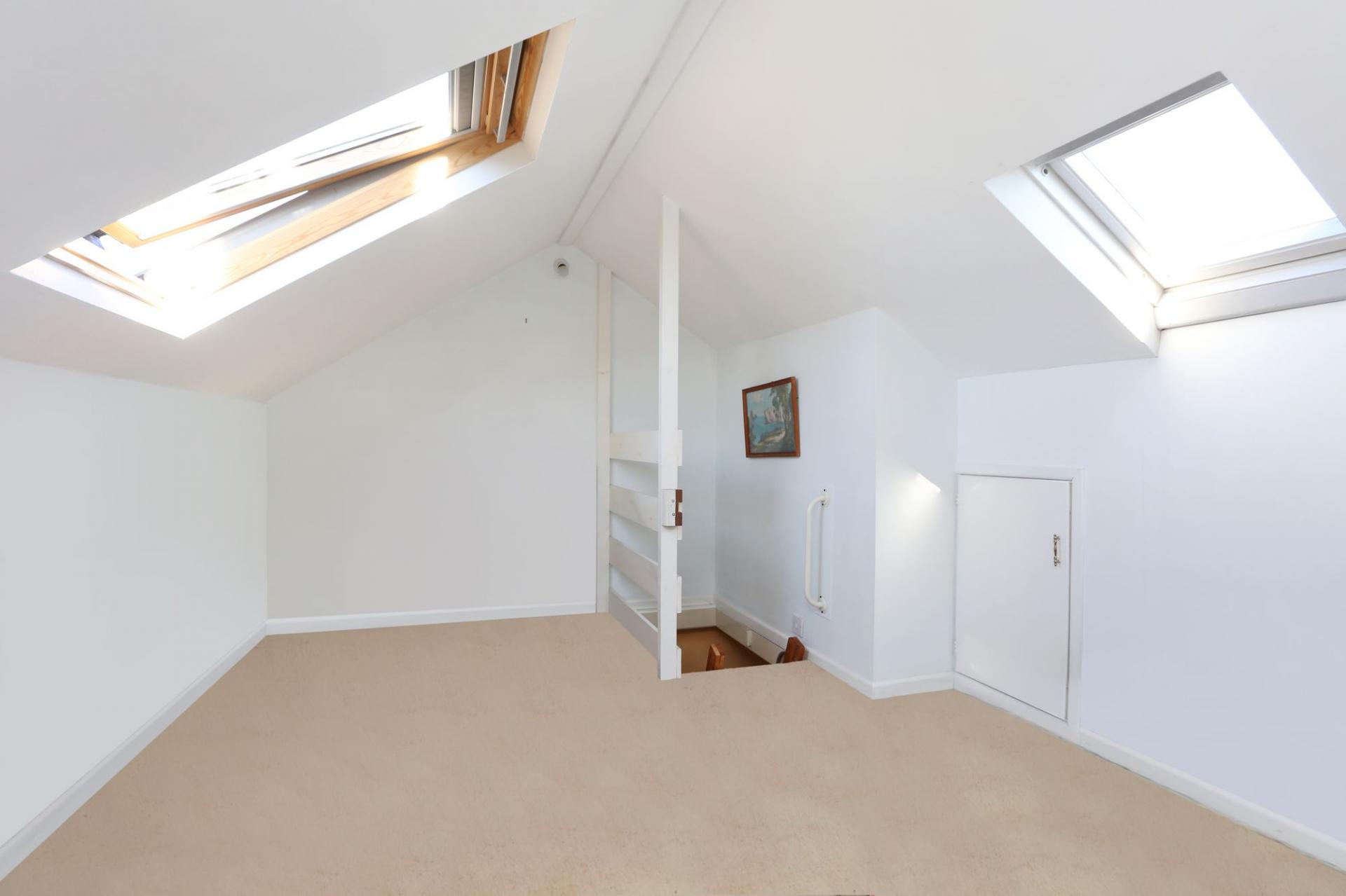 On the first floor landing there is access via a pull-down ladder/staircase to a sizable loft room, which is an additionally bright room with Velux windows to the front and rear. The good size master bedroom overlooks the front of the house towards the water, whilst bedroom two, also a double room, enjoys views over the pretty rear garden. The bathroom, which was updated several years ago, has a panelled bath, separate shower cubicle and wash hand basin set into a vanity unit with cupboards below, along with a WC and airing cupboard to one side of the room.