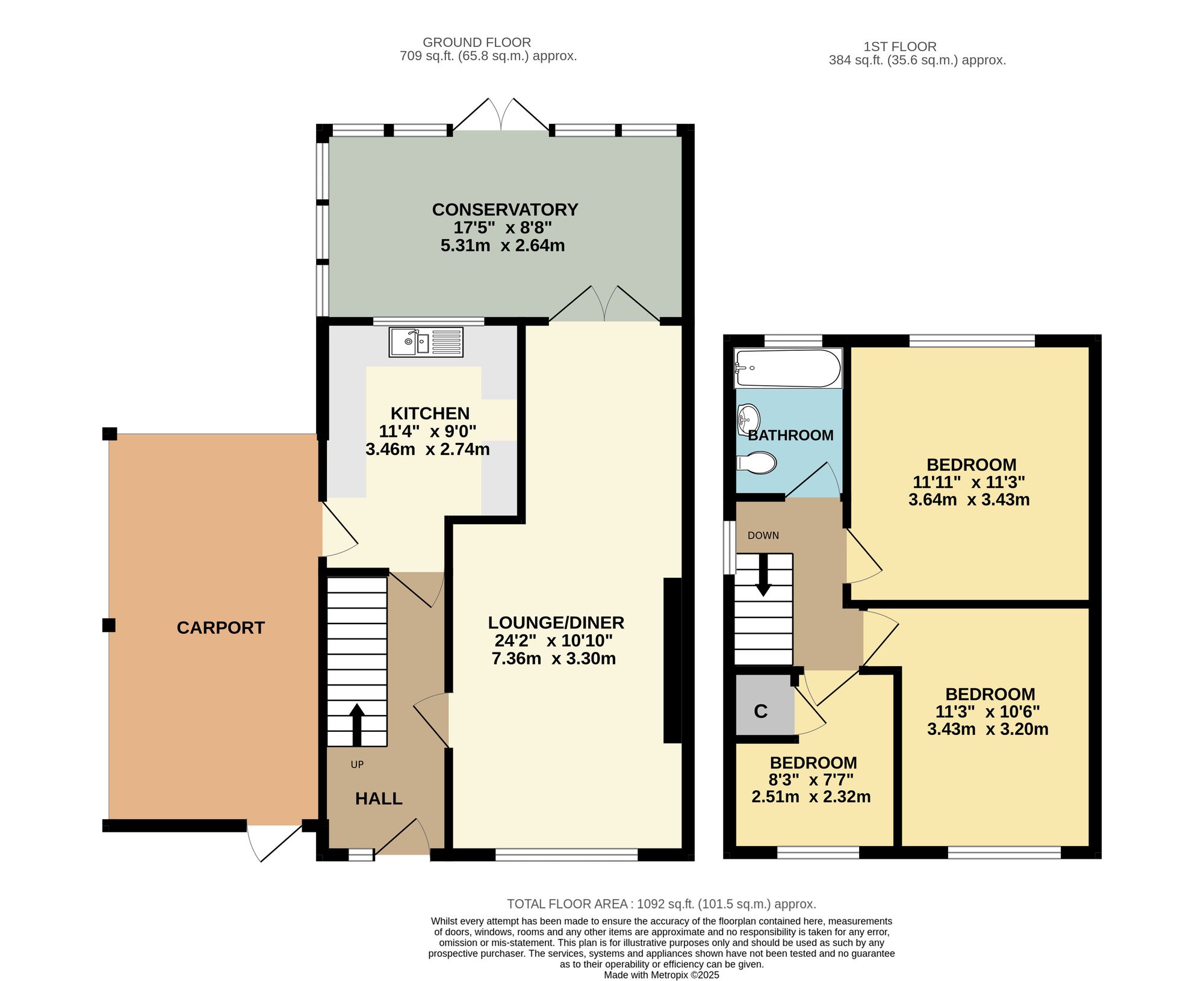 To the front there is a lawned garden with a pathway to the front door and a gate leading through to the carport.