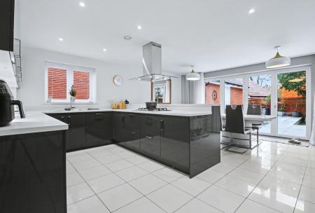 The impressive kitchen/breakfast room has been fitted with a range of stylish wall and base units with a built-in oven and five ring gas hob, as well as an integrated dishwasher and fridge/freezer. There is tiled flooring throughout and bi-fold doors opening out to the rear garden.