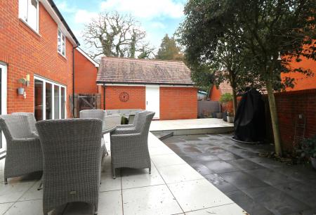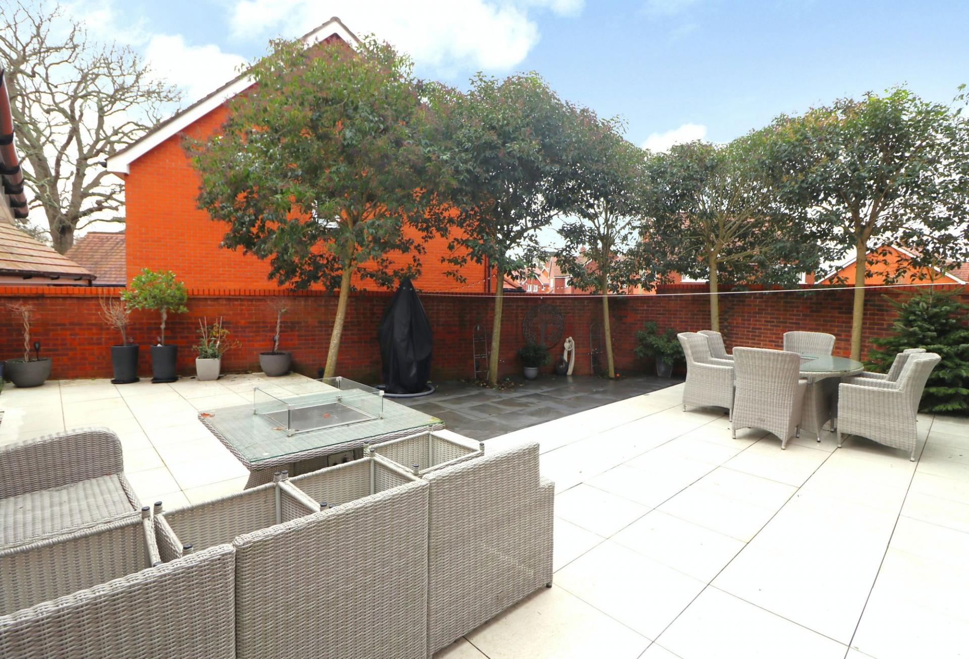 The attractive, rear garden enjoys a private outlook and has been fully landscaped with paving and features a hot tub (included), tucked away behind the garage.