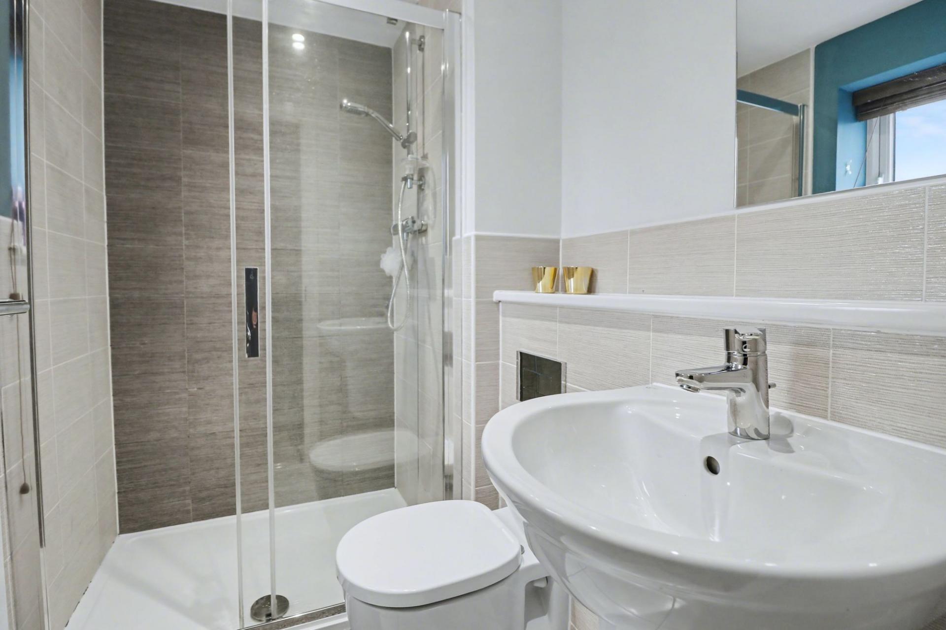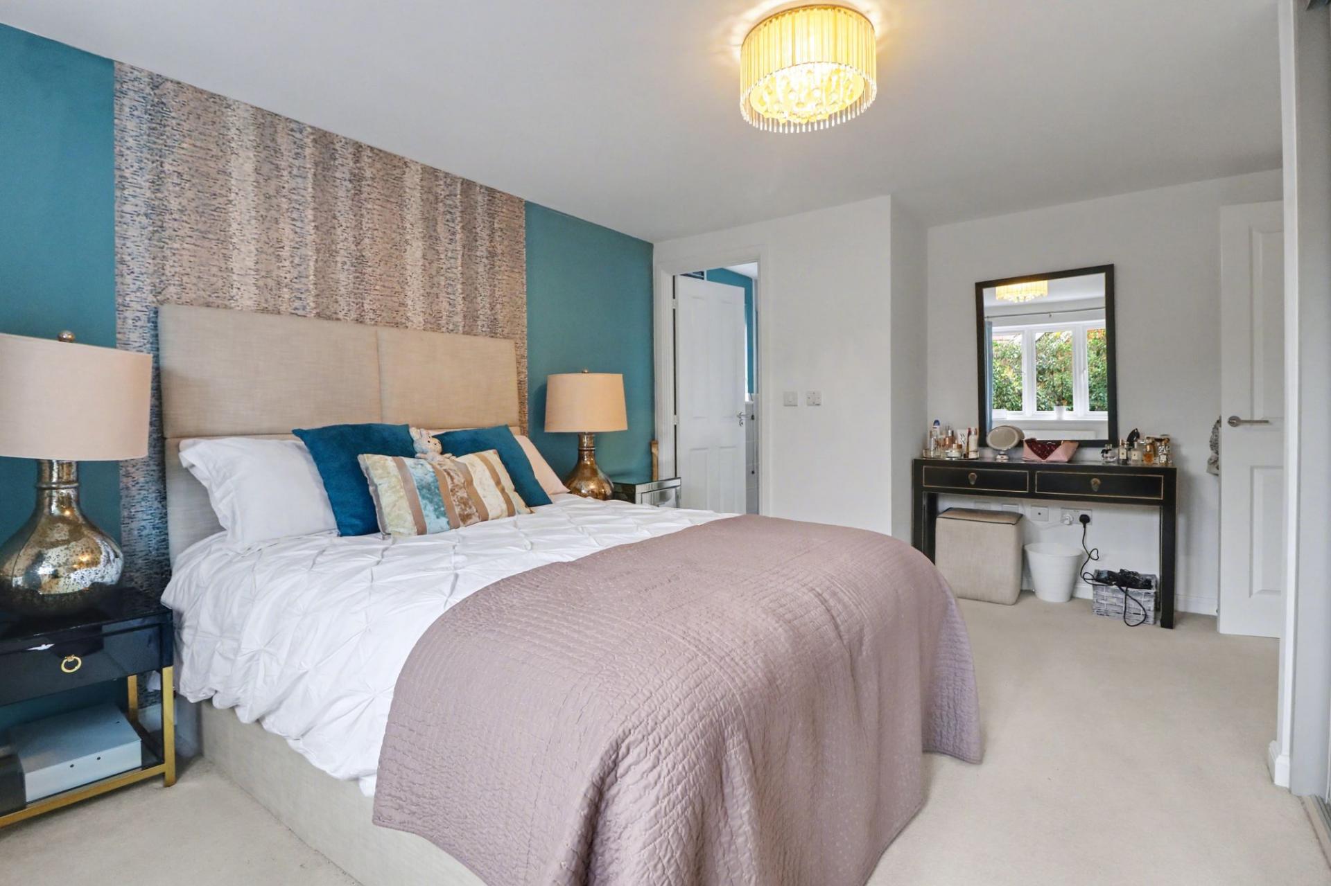 The bright and spacious master bedroom has fitted wardrobes to one wall, a window to the rear and a contemporary en-suite shower room. Bedrooms two and three both face the front of the property, with the second bedroom also featuring an en-suite shower room.