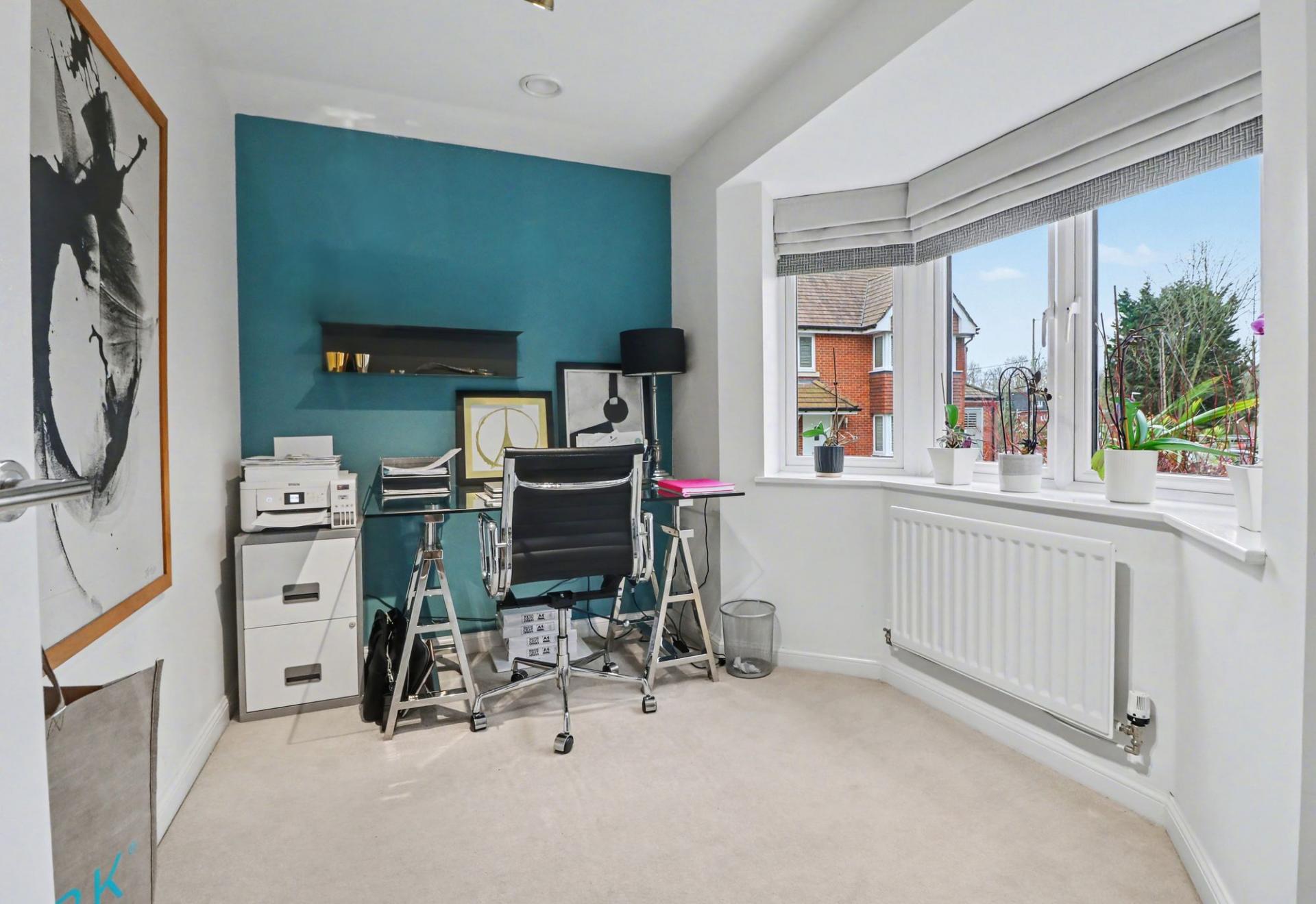 The spacious lounge enjoys a dual aspect with a bay window to the side and bi-fold doors to the rear leading out to the garden. To the front there is a dining room and study, which both have bay windows.