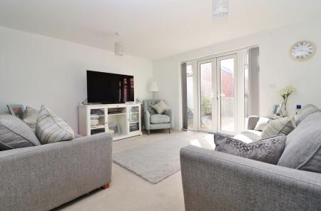The generous lounge enjoys French doors, with full-length windows either side, opening out to the rear garden.