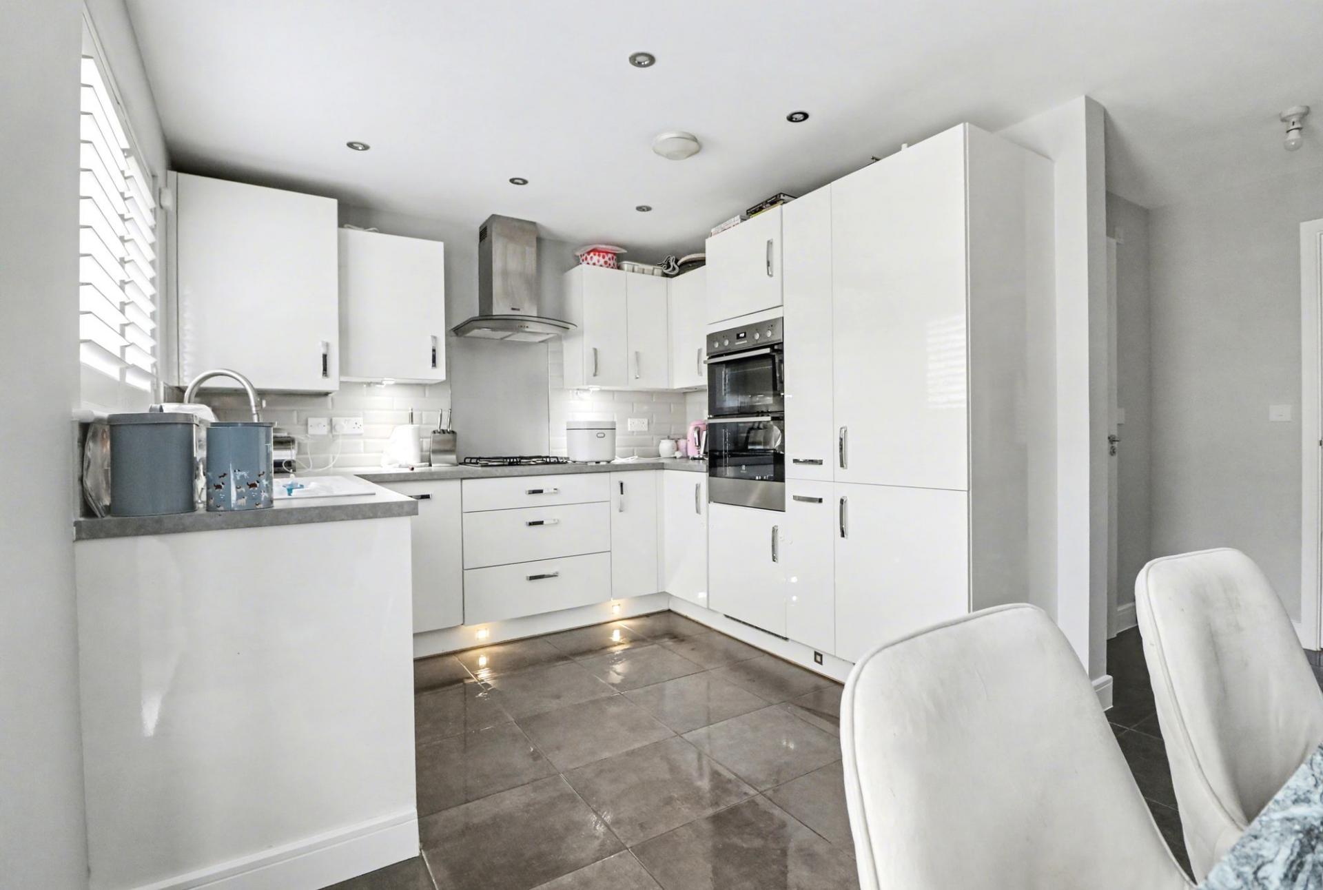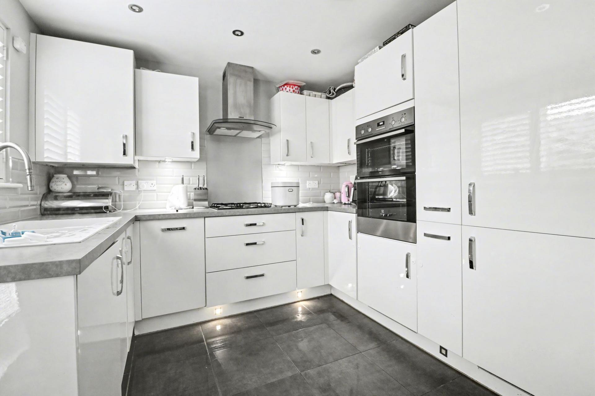 The spacious kitchen/diner has been fitted with a modern range of wall and base units with a built-in double oven and gas hob with extractor over, as well as an integrated fridge/freezer, dishwasher and washer/dryer. French doors from the dining area open out to the rear garden and there is a built-in storage cupboard to one side.