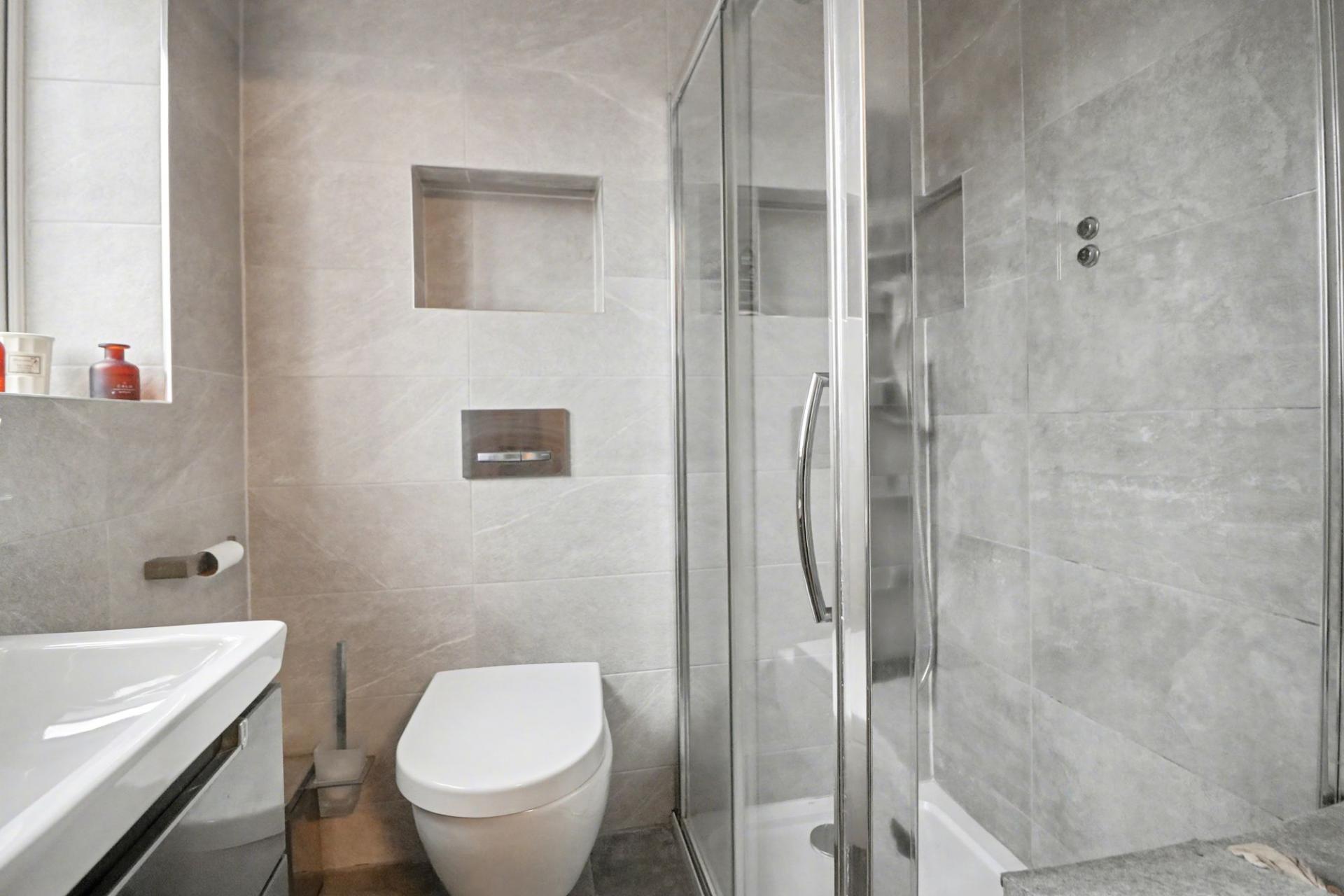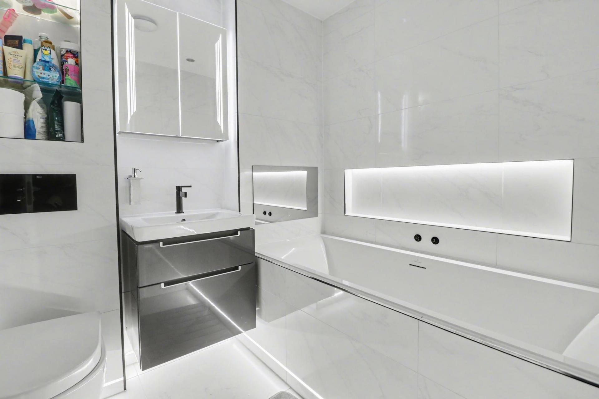 The stylish family bathroom comprises a tiled enclosed bath, vanity wash hand basin, WC and feature lighting.