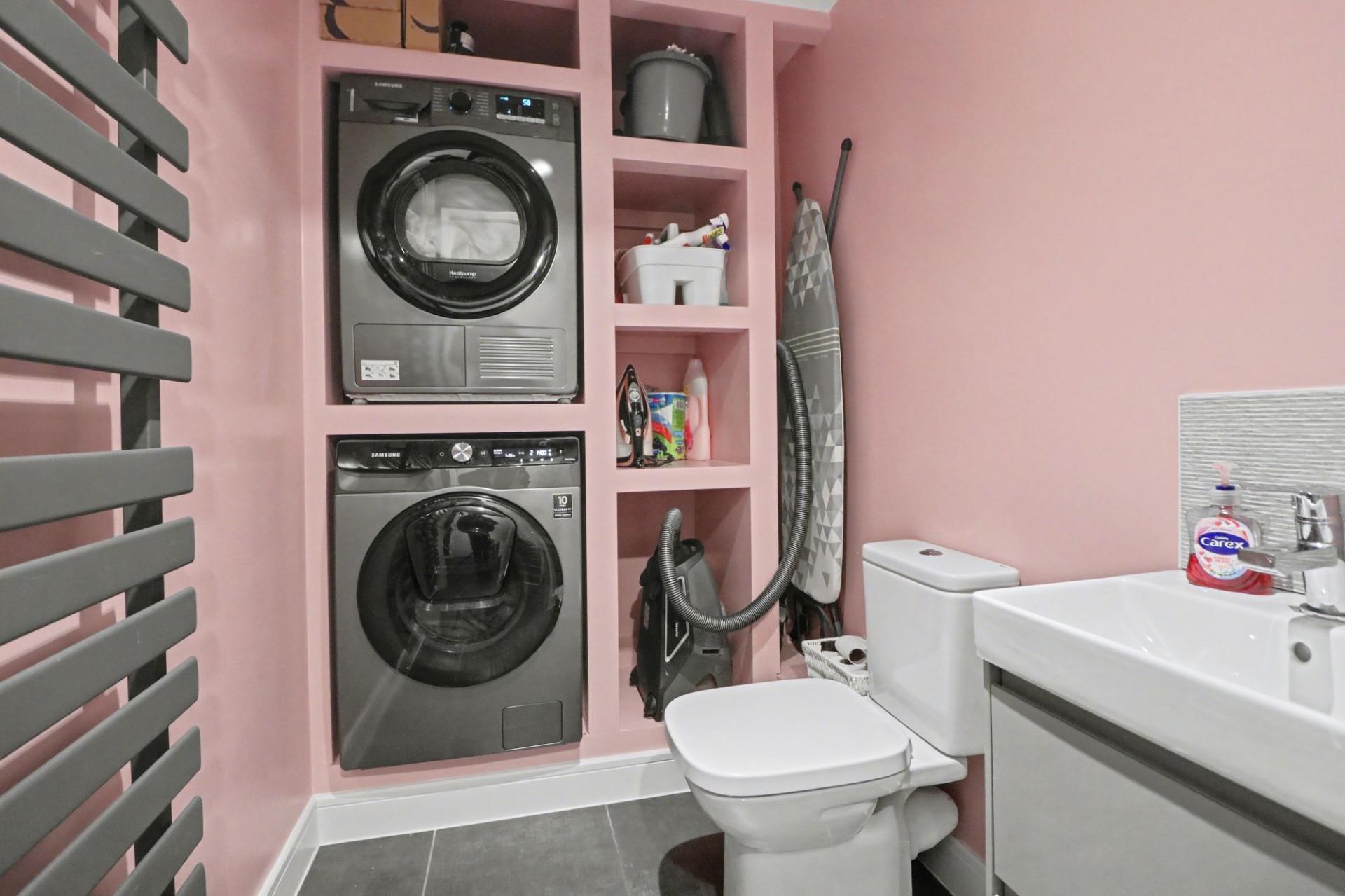 The utility/WC has a vanity wash hand basin, heated towel rail, WC and appliance space for a washing machine and tumble dryer.