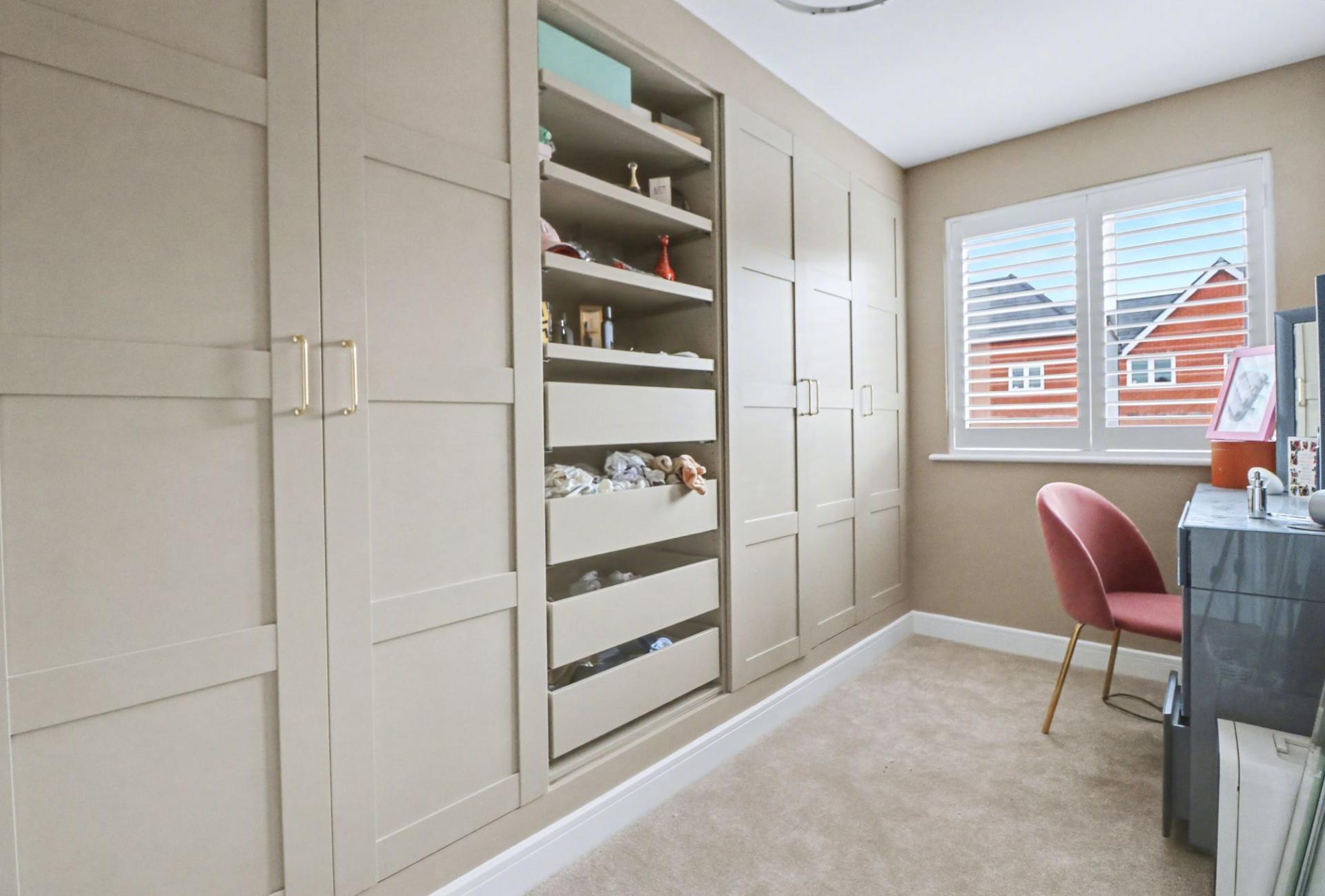 Bedroom two overlooks the rear garden and has a built-in wardrobe, whilst the third bedroom is currently being used as a dressing room and has fitted wardrobes along one wall and a window to the rear.