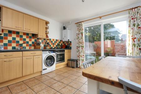 Step through the front door into the hallway, with its beech-toned wood flooring, which feels warm and inviting; a space that draws you in and sets the tone for the rest of the home. From here, the house opens into the heart of the ground floor: a generous kitchen and dining space designed for both everyday living and relaxed entertaining.