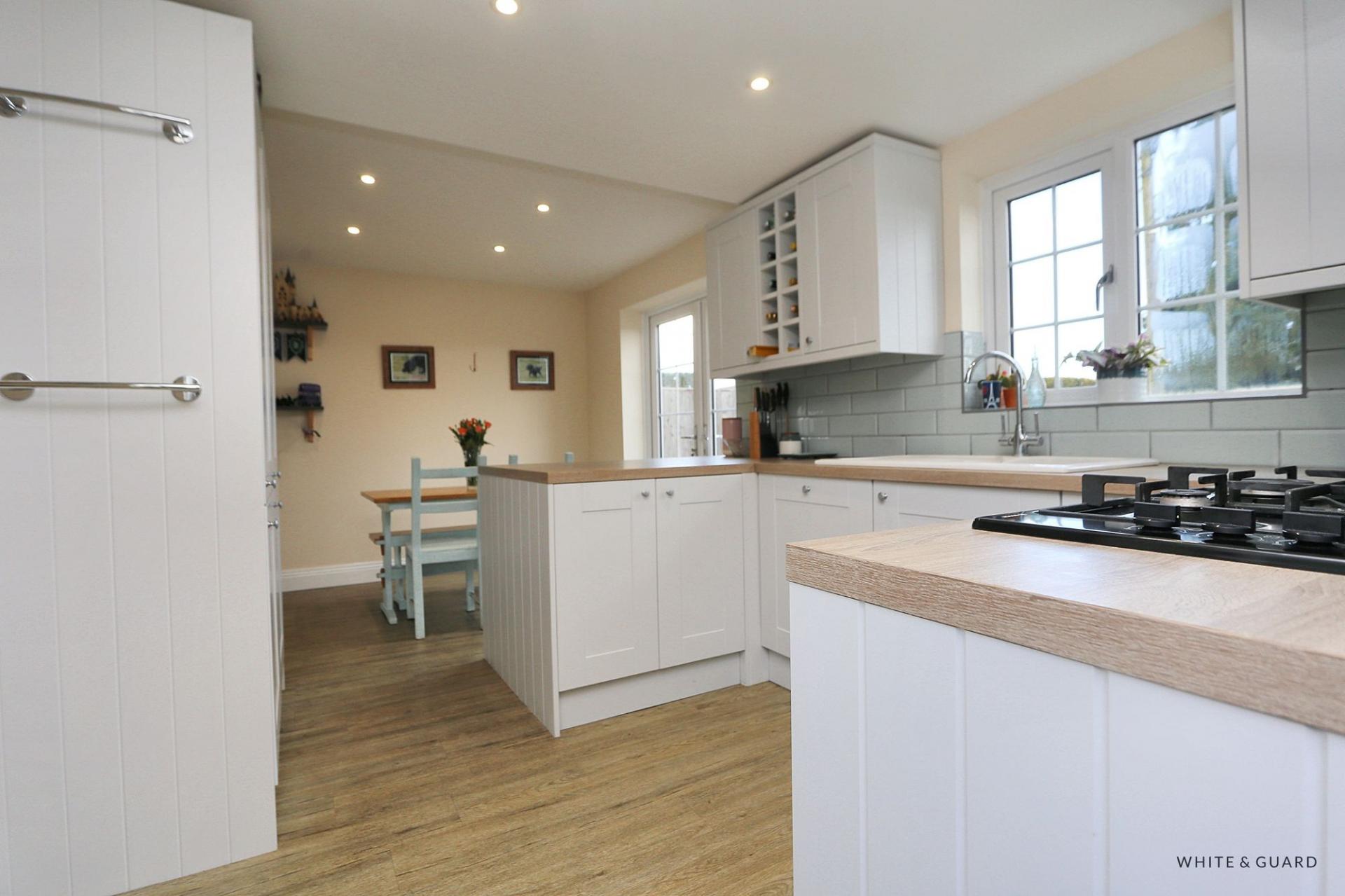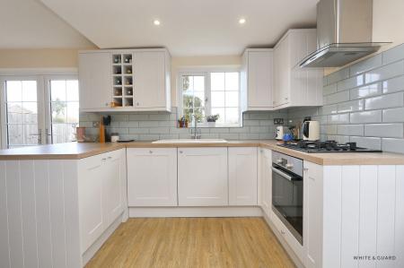 A double glazed front door opens into a bright and welcoming reception hall, stairs lead to the first floor while the space extends into the kitchen dining room. The well-appointed kitchen comprises a range of matching wall and base level work units with fitted wood effect work surfaces over which incorporates an inset ceramic sink and drainer unit, inset gas hob and electric oven, while further integrated appliances include a fridge, freezer and dishwasher. Space and plumbing are provided for a washing machine, there is a built in storage cupboard and a double glazed door to one side opens to the outside. The dining area, open to the kitchen enjoys a nice outlook onto the garden through double glazed French doors and a double width opening leads through to a living room which benefits from a log burning fire with exposed brick surround and hearth.