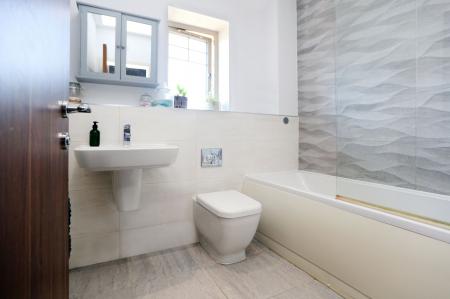 The family bathroom has a modern suite with panelled bath with shower over, wash hand basin and low level WC, heated towel rail, complimentary tiling and spotlights.