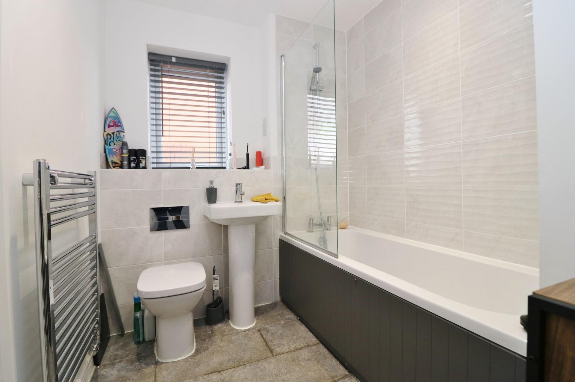 The modern family bathroom comprises a panel enclosed bath with shower and screen over, WC, wash hand basin and a window to the side.