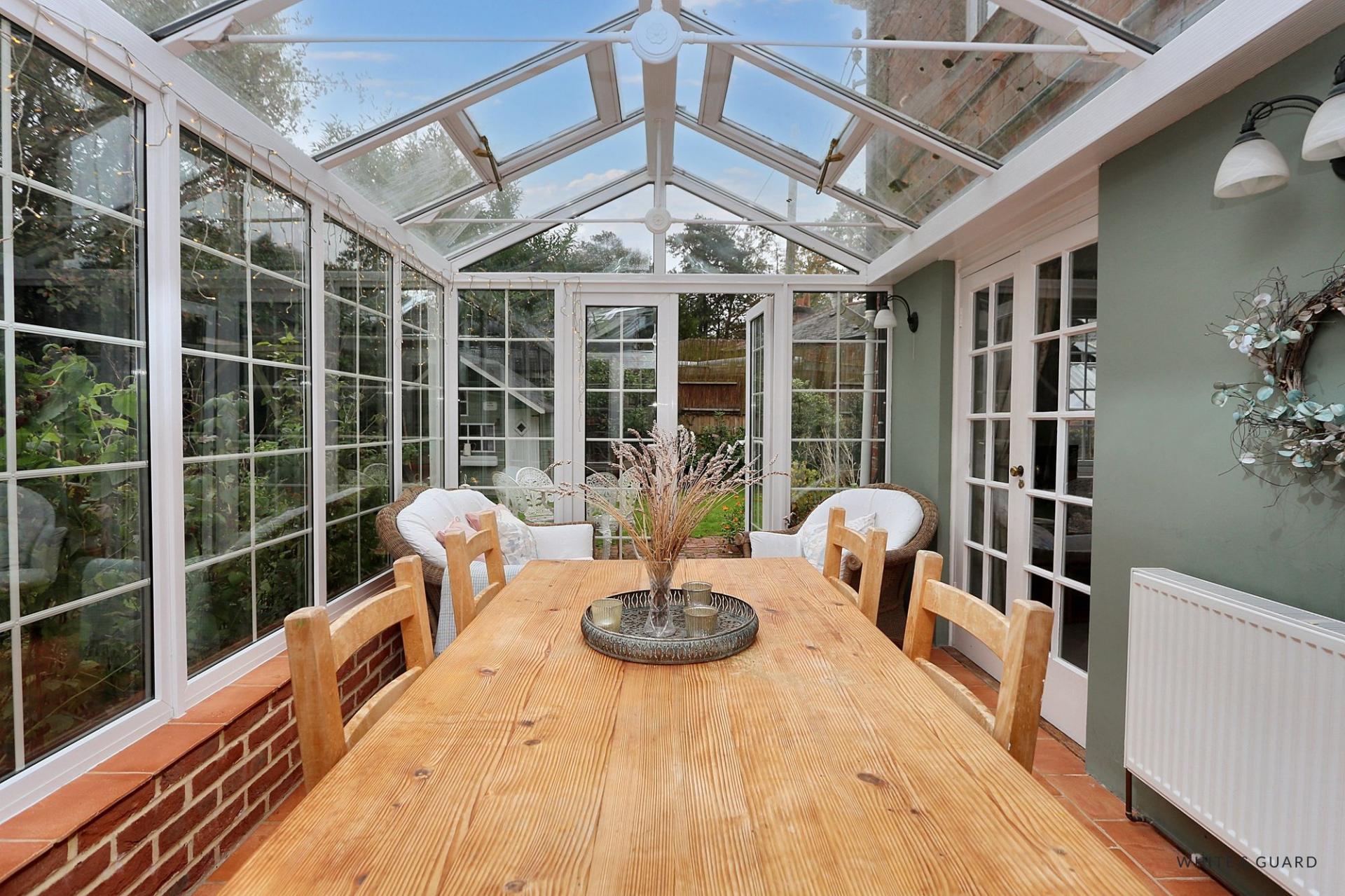A solid farmhouse-style door opens into an impressive entrance hall, setting a warm and welcoming tone from the outset. The tiled hallway branches naturally into the study, kitchen, and main living areas, offering a lovely flow through the home. The lounge is a standout space, both cosy and bright, with triple-aspect windows filling the room with natural light. The exposed brick fireplace with a log-burning stove creates a striking focal point, perfect for relaxing evenings. Across the rear, the grand conservatory extends the living space beautifully, with terracotta tiling and views of the garden. It’s ideal for morning coffee, family gatherings, or evening entertaining. The country-style kitchen combines rustic charm with functionality, offering solid wood worktops, a range cooker, and garden views that make it a pleasure to spend time in. A separate study or snug provides a quiet retreat or flexible home office space.