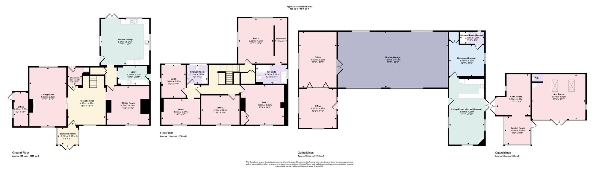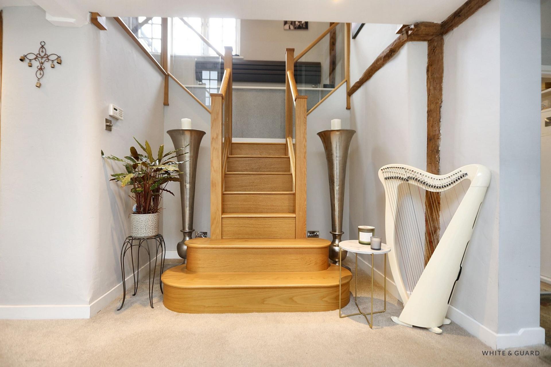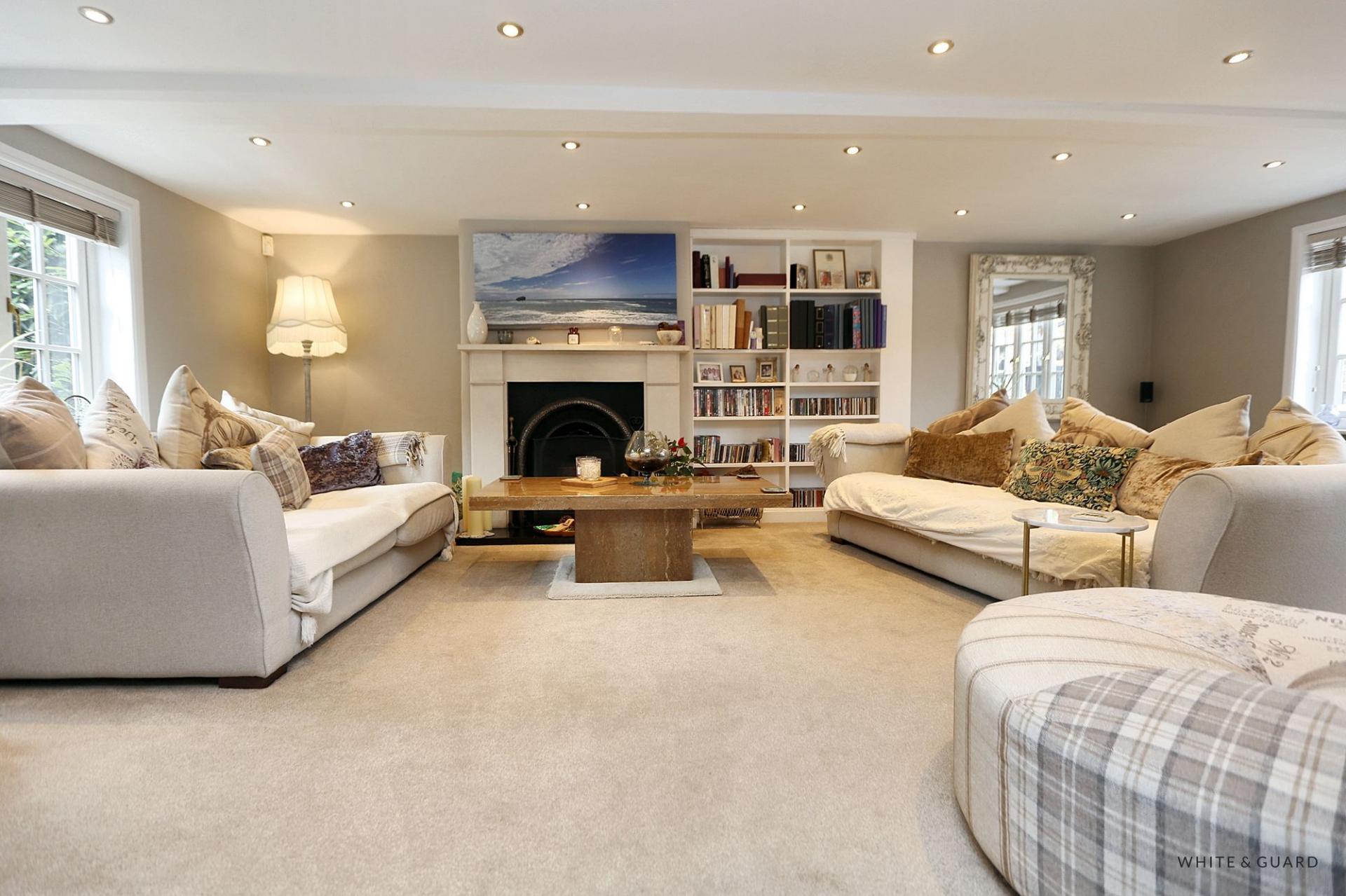 Entry to the main residence is gained through a vaulted oak framed porch, which in turn leads to a magnificent reception hall and truly sets the tone for this most impressive home. The reception hall features a bespoke oak and glass Neville Johnson split staircase and is complemented by exposed beams and spot lighting. To one side, a set of contemporary frosted glazed sliding doors open to a substantial yet cosy living room, the dual aspect room has a feature fireplace and designer radiators. A formal dining room boasts a stunning inglenook log burning fire set with an oak surround and is laid to an original stone floor, adjacent to the dining area is an inner hallway which conveniently leads to both the kitchen and utility room. The kitchen itself has underfloor heating and provides an extensive range of matching wall and base units set with black granite work surfaces over, that incorporate an inset butler sink and induction hob. Further integrated appliances include a double oven and microwave and wine cooler, while space is provided for an American style fridge freezer. The large kitchen comfortably accommodates space for a dedicated dining table and chairs. A purposeful utility room has a range of base level units, fitted oak work surfaces over with an inset butler sink, there is also space and plumbing for a washing machine. Pantry style storage can be found to one wall and a composite stable door opens to the outside. Completing the ground floor accommodation is a cloakroom WC, complete with coat storage, WC, pedestal wash hand basin and heated towel rail.