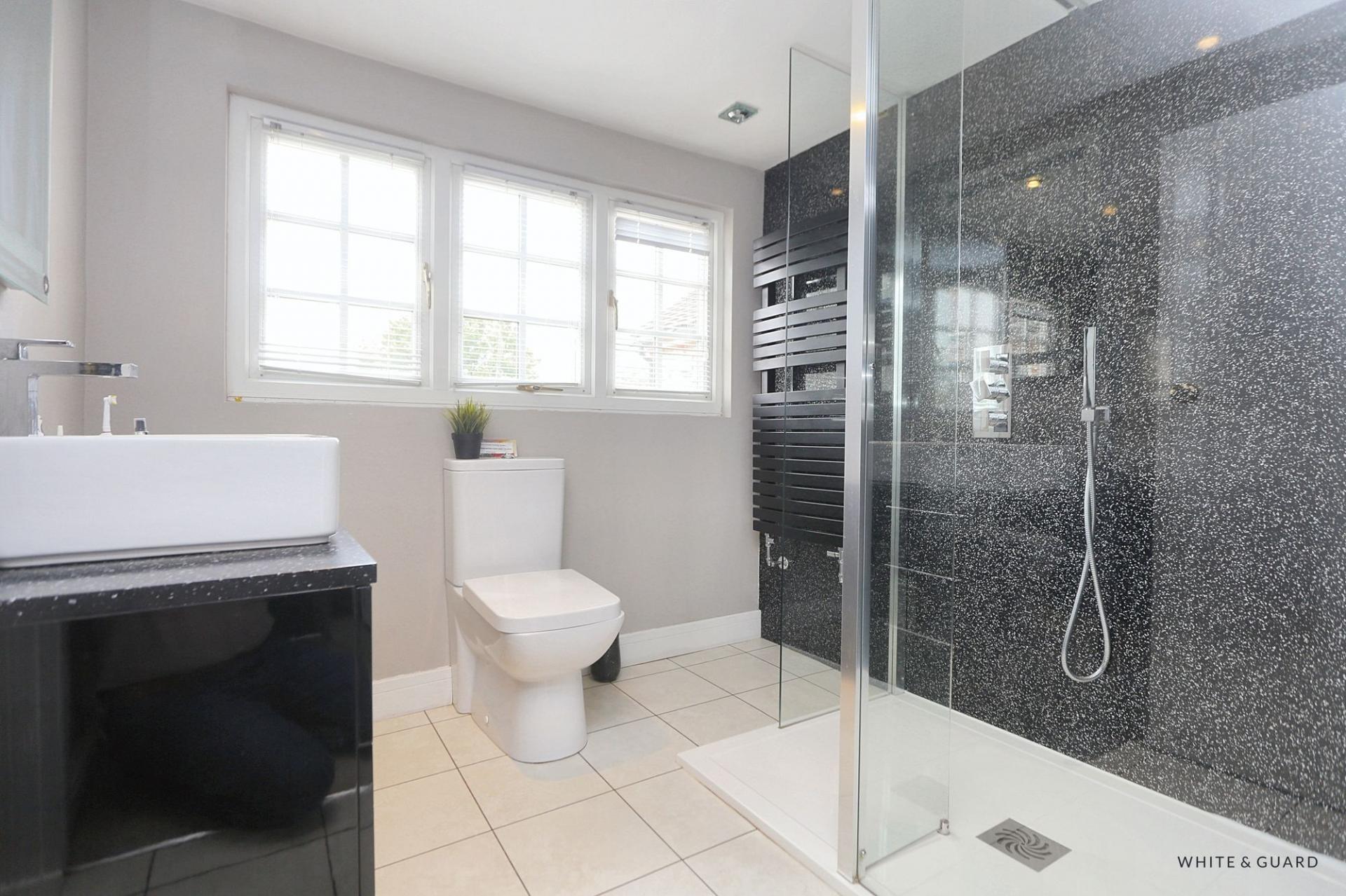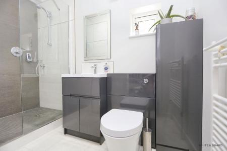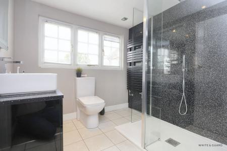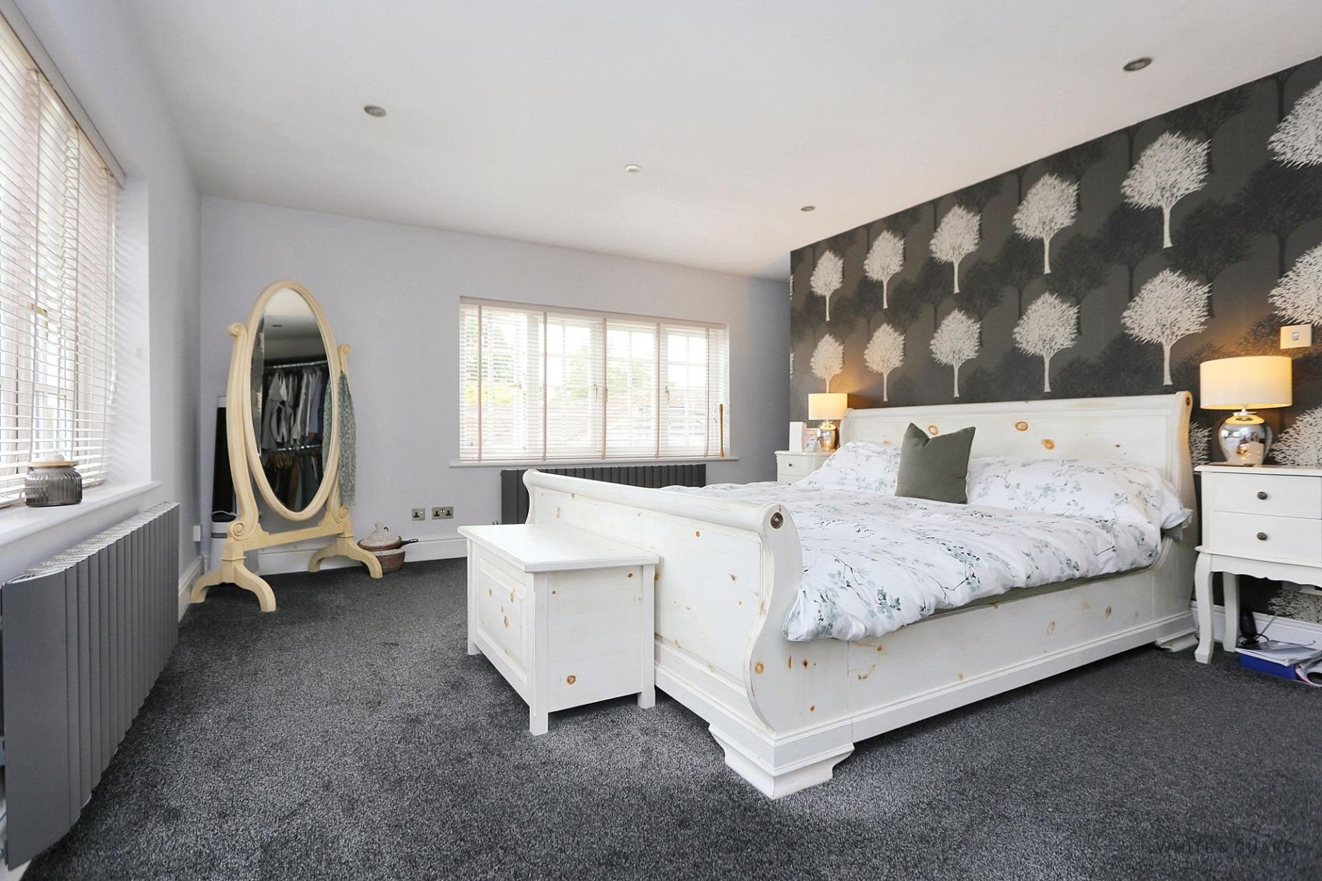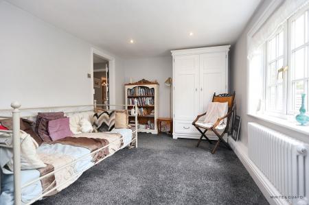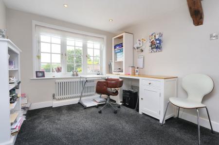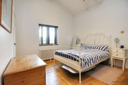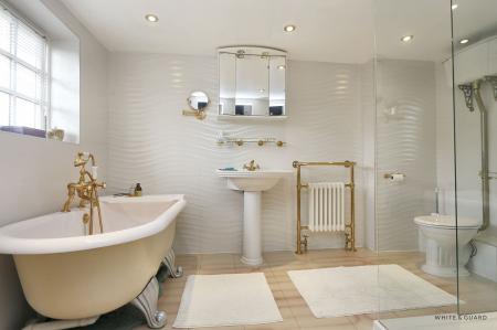 The split level landing enjoys a beamed and vaulted ceiling, and doors lead the principal first floor rooms. The notable master bedroom offers elevated views across the grounds and countryside beyond, the substantial double room benefits from walk through wardrobes and dressing area that span the width of the room. The main bedroom is serviced by a well-appointed four piece en-suite that comprises a freestanding roll top bath, walk in shower cubicle, high flush WC and wash hand basin. Bedrooms two, three and four are all well proportioned double rooms allowing plenty of space for freestanding bedroom furniture, while bedroom five is currently in use as a study. Servicing these bedrooms is a contemporary shower room complete with walk in shower with rainfall shower head, surface mounted wash hand basin, WC and matt heated towel rail.