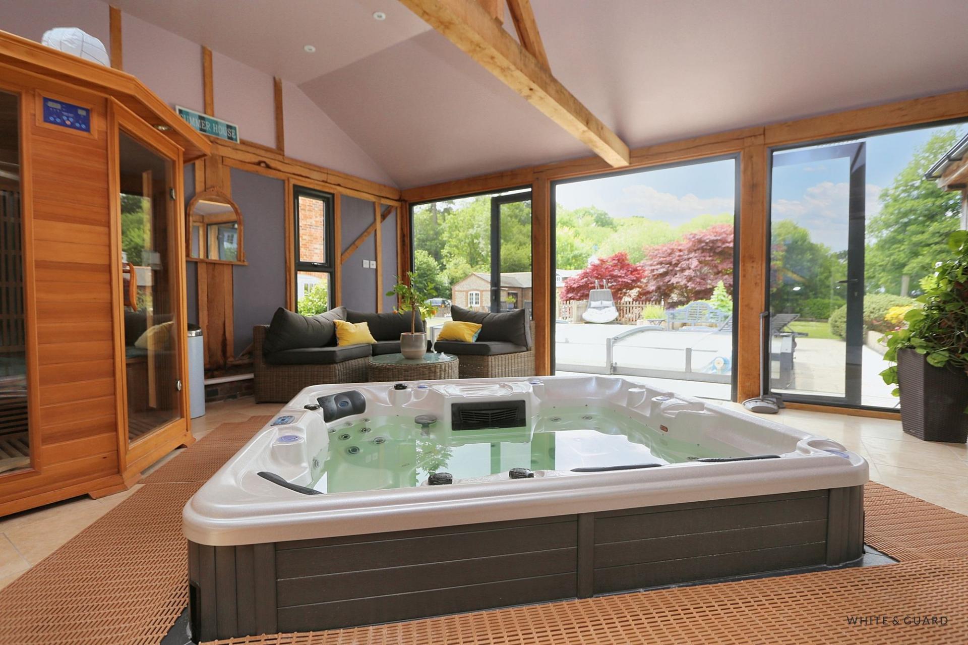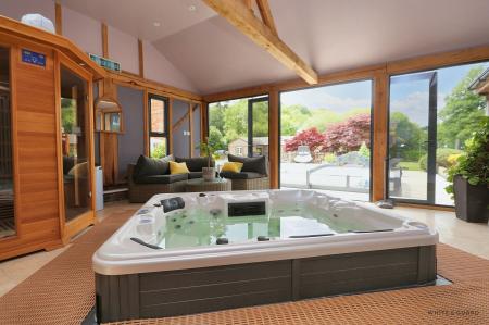 The stunning outside areas offers a multiple range of areas to enjoy. Extending from the back of the house is block paved terrace which hosts an original well and delivers a subtle nod to the property’s rich history. A small range of steps lead up to a travertine patio terrace which incorporates an inset hydro swim spa and leads to an oak and glazed framed spa room with air condition and includes an inset hot tub, sauna, electric shower and WC. Adjoining the spa is a workshop and potting shed. An expanse of lawn extends towards the rear boundary, where a putting green can be found and stables. The wonderful gardens are set with a range of shrubs, trees and hedging and provide far reaching views across fields and countryside.