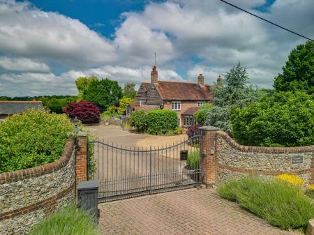 The property is approached via double electric gates with a characterful flint wall set across the front boundary, the gates open to an expanse of parking options which include a gravelled circular driveway set within the mature and established front gardens and an allotment area. Adjacent to the main house, is a country style courtyard suitable for a wide array of vehicles, offering entry to the triple double garages equipped with electric doors.