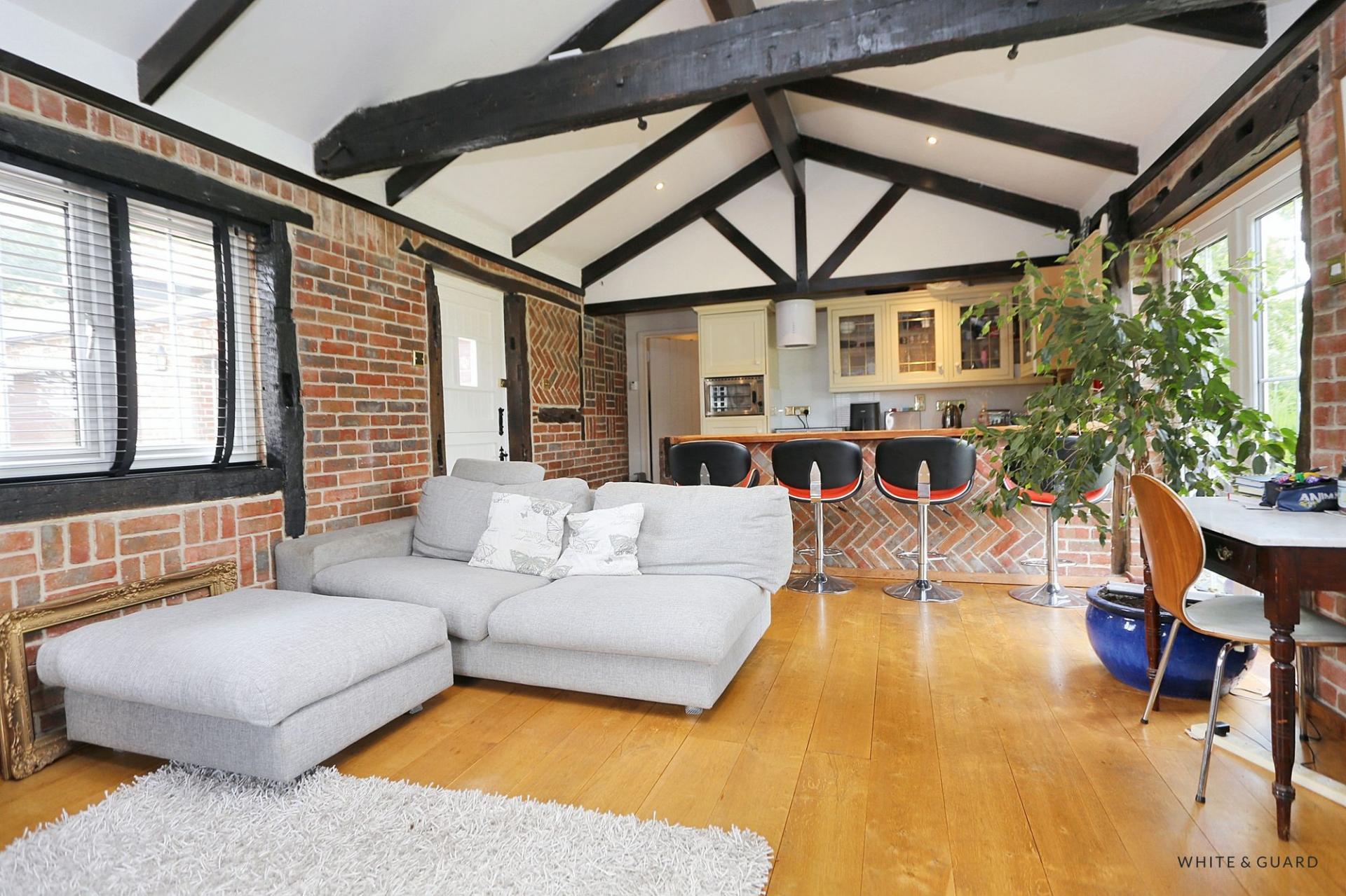 Ancillary to the main house is a substantial outbuilding which provides an outstanding self-contained annexe featuring oak flooring and vaulted ceiling within the open kitchen living area, and double doors open to a private garden. The kitchen offers a fitted breakfast bar, dual microwave/oven, fridge dishwasher and butler sink with mixer tap. Through this room is a double bedroom with built in wardrobes and en-suite featuring a fully refurbished walk in shower. Forming part of this “U” shaped outbuilding are two large office spaces which could offer multiple uses to suit a prospective purchaser.