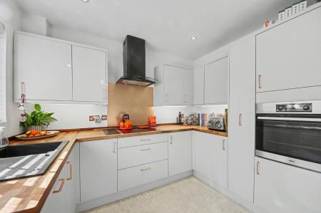 The kitchen strikes a perfect balance between modern and timeless design, featuring sleek high-gloss cabinetry paired with rich butcher block worktops. It’s a space that feels both stylish and practical, ideal for busy mornings, weekend baking sessions or hosting with ease.