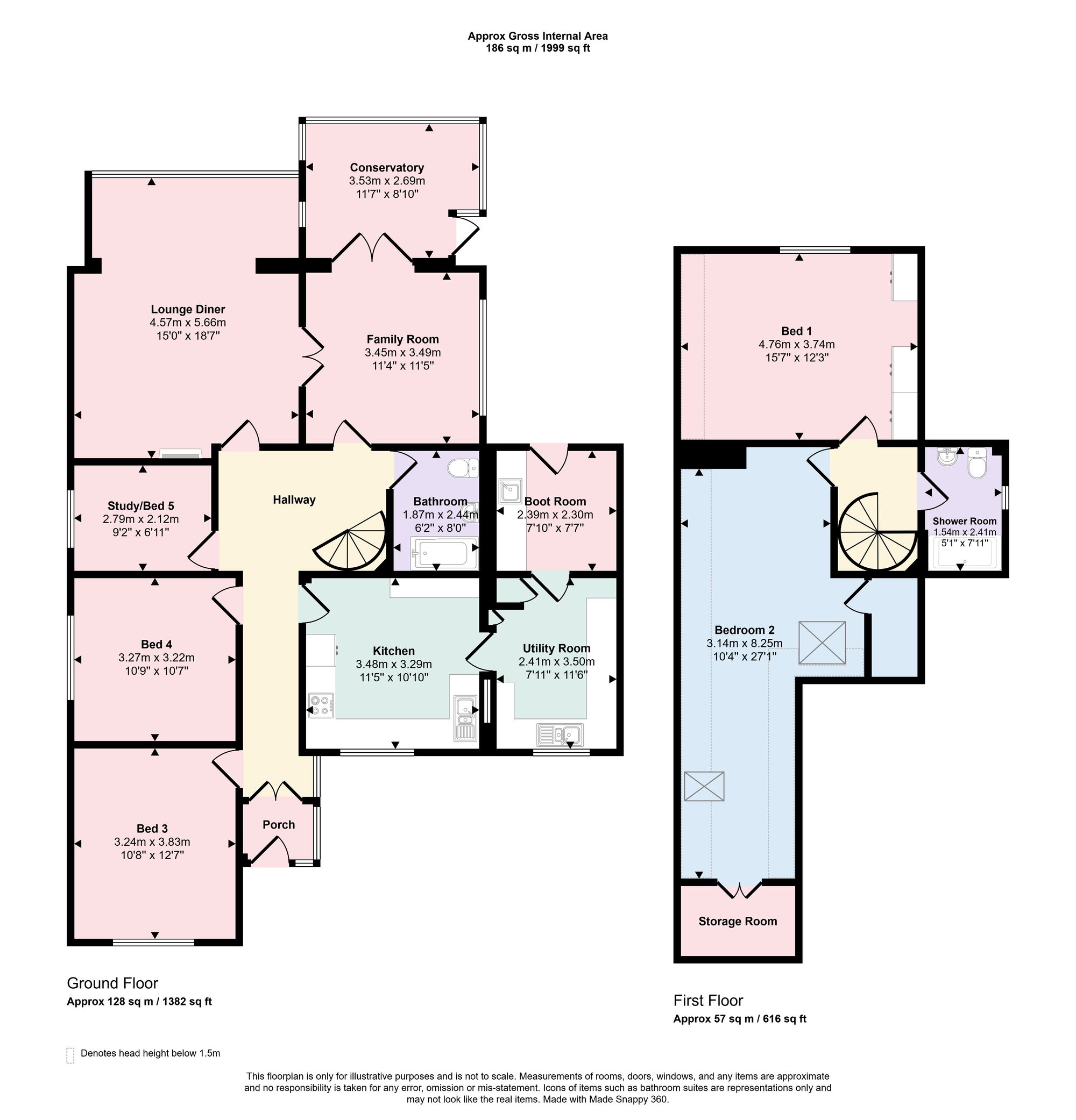 An enclosed double glazed porch provides useful shoe and coat storage, double doors open into the entrance hall which provide access to the first floor via a feature spiral staircase and doors lead to the principal ground floor accommodation. The well-proportioned lounge dining room has an open fireplace and inset wood burning stove with fitted shelving above and to the side. The room also benefits from an attractive and extended box bay window overlooking the rear garden and allows space for a dining table and chairs. A set of double doors lead through to a light and airy family room which overlooks the side of the property and has a further set of French doors leading through to the conservatory which overlooks the rear garden. The kitchen/breakfast room has a double glazed window to the front and is fitted with a matching range of wall and base units with cupboards and drawers under alongside fitted work surfaces which incorporate an inset stainless steel sink and drainer unit. There is a built-in double oven and gas hob with extractor over and a fitted breakfast bar to one side. A door leads through to a purposeful utility room which has a range of fitted work tops, wall and base storage units and an inset sink and drainer. There is undercounter space and plumbing for a washing machine, fridge, freezer and a wall mounted central heating boiler. The adjoining boot room has a further range of base level storage units, fitted work tops and sink and also provides useful storage options. Bedroom three overlooks the front of the property and is a good size double room, as is bedroom four, which has a window to the side. Bedroom five / study also on the ground floor has a window to the side. While completing the spacious ground floor area is a family bathroom suite which comprises a panel enclosed bath with shower attachment, inset wash hand basin and WC and fully tiled walls.