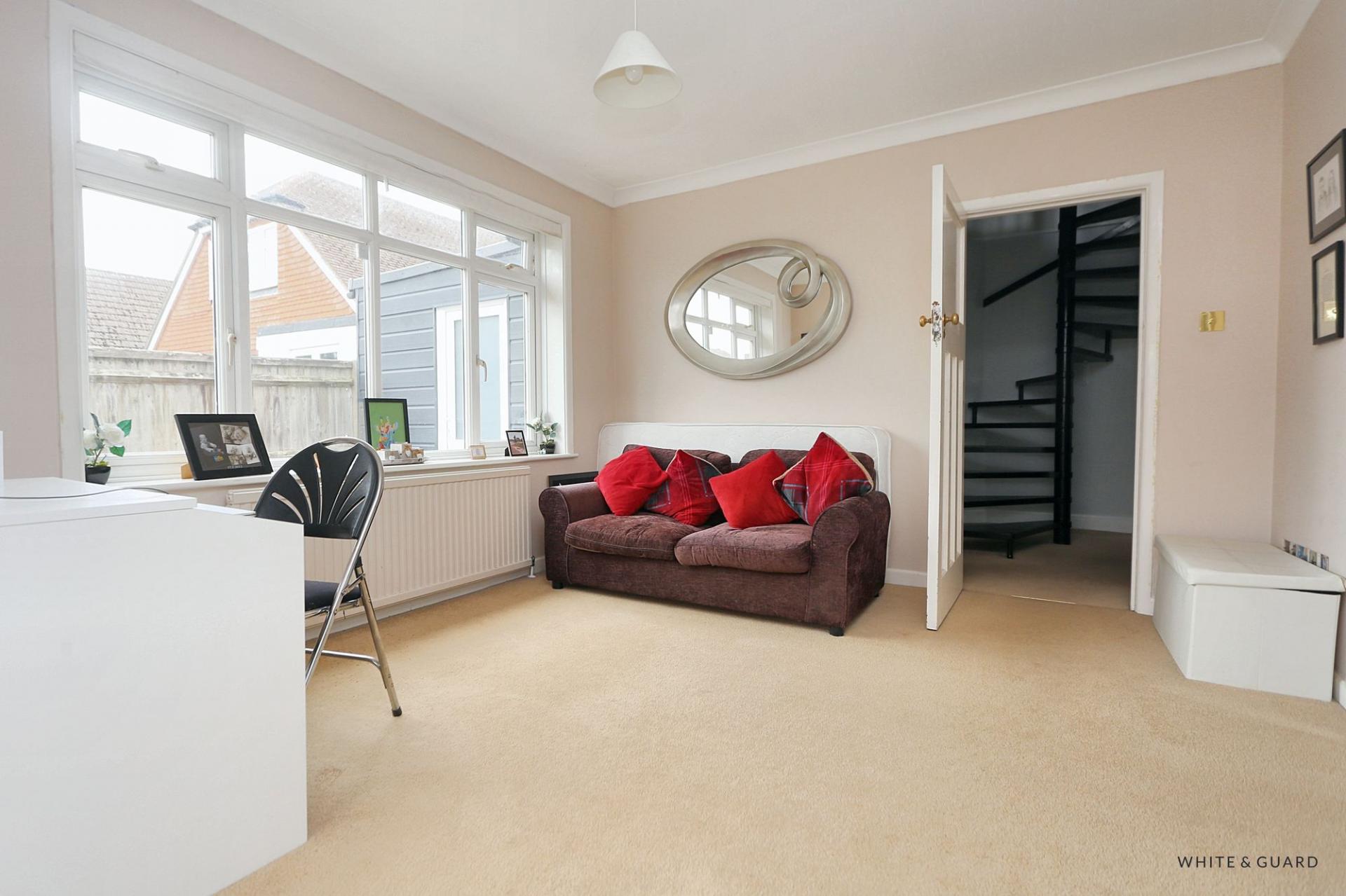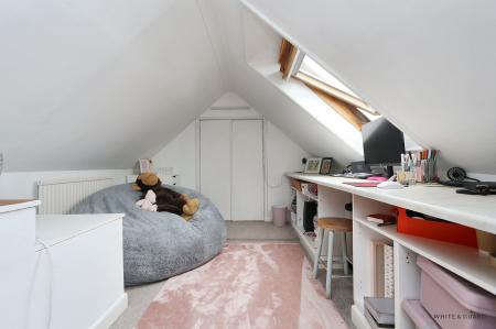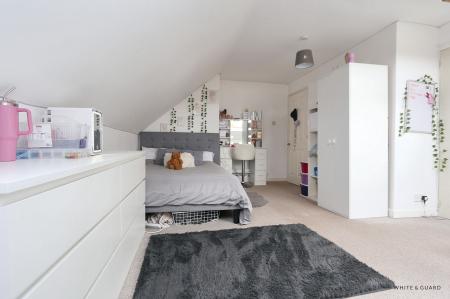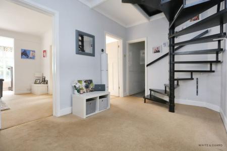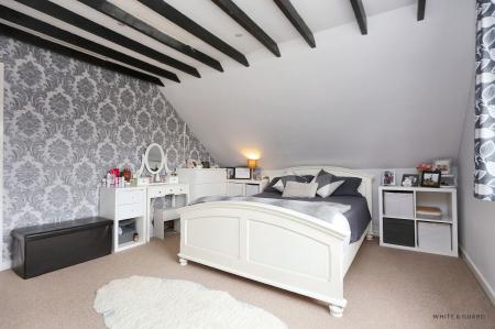 The striking spiral staircase from the hallway leads to the first floor landing which has doors to bedrooms one and two and a modern shower room. Bedroom one is well proportioned with window to the rear overlooking the rear garden and benefits from fitted wardrobes and an exposed beamed ceiling. Bedroom two is a large T-shaped room, with sloping ceilings, Velux windows to both the front and side and providing access to eaves storage space and a set of double doors at one end of the room leading through to a useful boarded loft space. The well-appointed shower room comprises a walk in main shower cubicle, wash hand basin, WC, and heated towel rail.