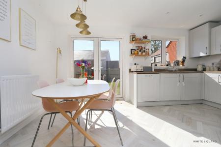 A front door opens into the entrance hall which is laid to herringbone wood effect flooring, has a flight of stairs leading to the first floor and a door opens into the living room. The well appointed room has a feature panelled wall, double glazed windows to the front elevation and a radiator to one wall. An inner hall gives access to a ground floor cloakroom and fitted storage cupboard and leads through to a bright and airy kitchen dining room which extends across the rear of the house. The kitchen itself comprises a matching range of wall and base level work units with fitted work surfaces over which incorporate an inset sink and drainer, gas hob and electric oven, while further integrated appliances include a fridge freezer, dishwasher and washing machine. The room provides space for a dining table and chairs and double glazed French doors open to the rear garden.
