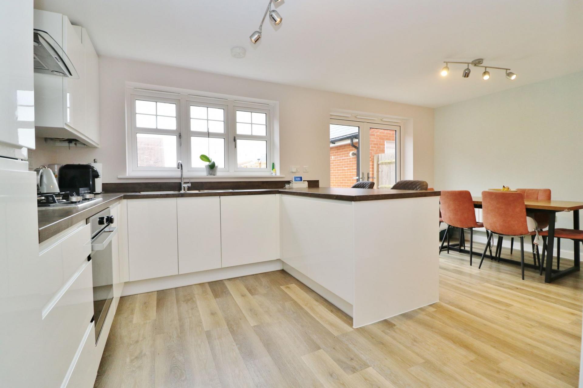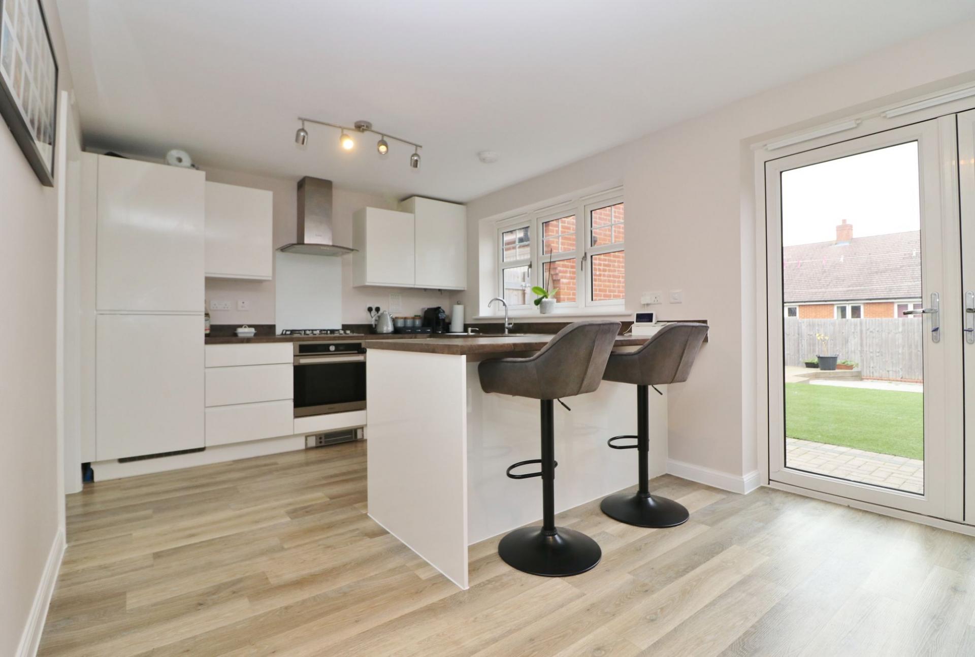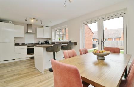 The lounge is a well-proportioned, dual aspect room with windows to the front and side, whilst the spacious kitchen/diner has a window to the rear and French doors from the dining area opening out to the garden.