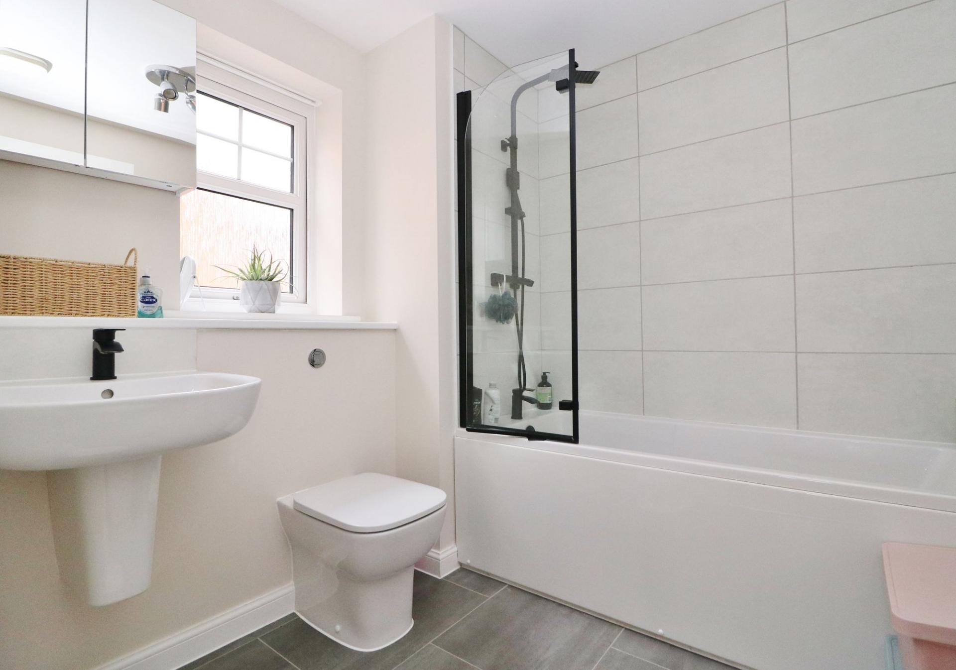 The modern family bathroom comprises a panel enclosed bath with shower and screen over, wash hand basin, WC and a window to the rear.