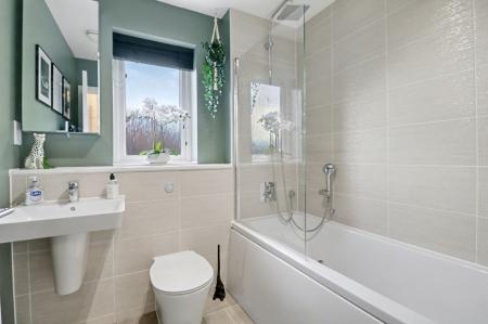 The contemporary family bathroom has a panel enclosed bath with shower and screen over, wash hand basin, WC and a window to the side.
