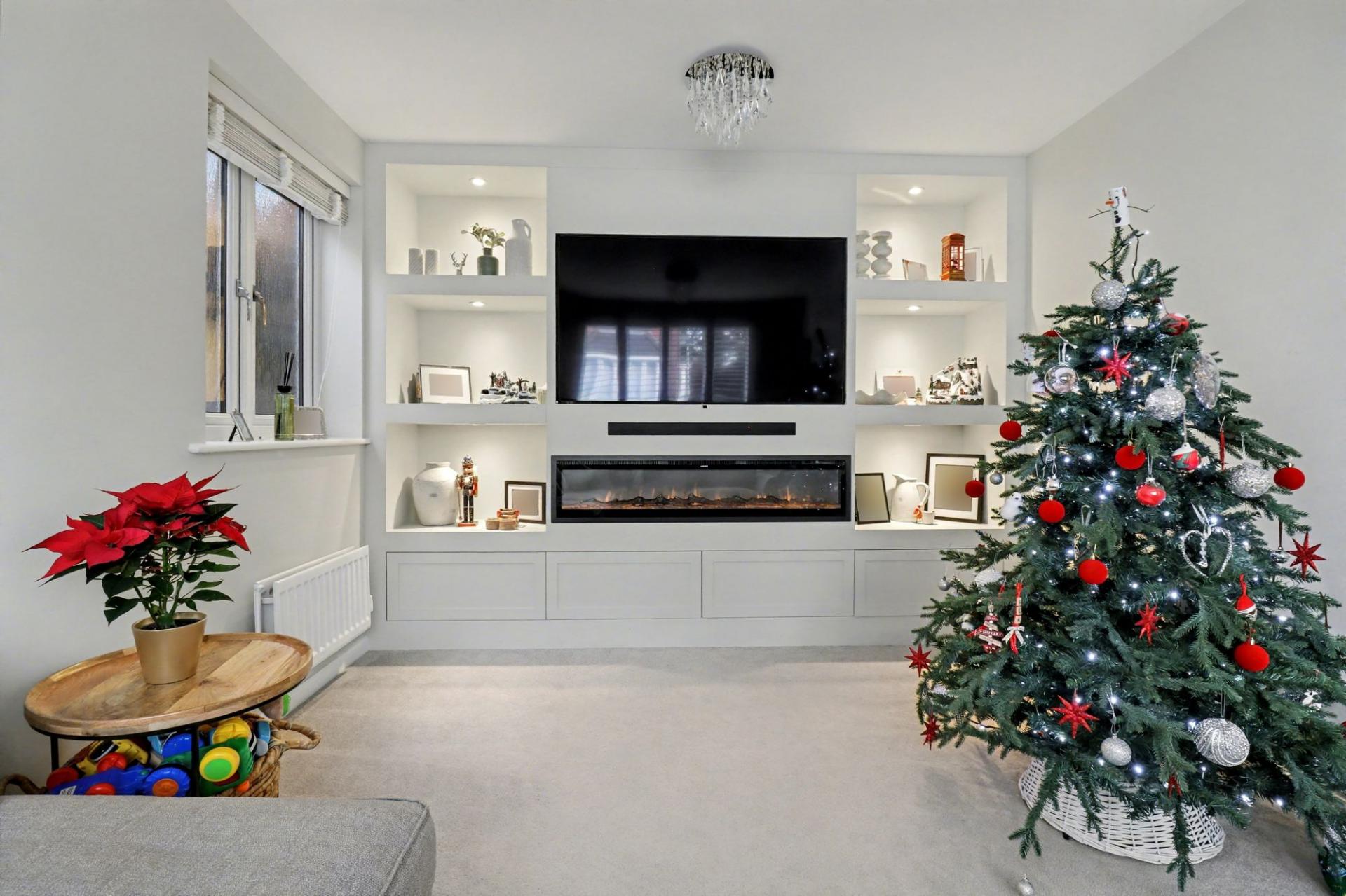 The generous sitting room faces the front of the property and is beautifully presented with a stylish media wall with fitted shelving and storage, as well as recess space for a TV and fire.