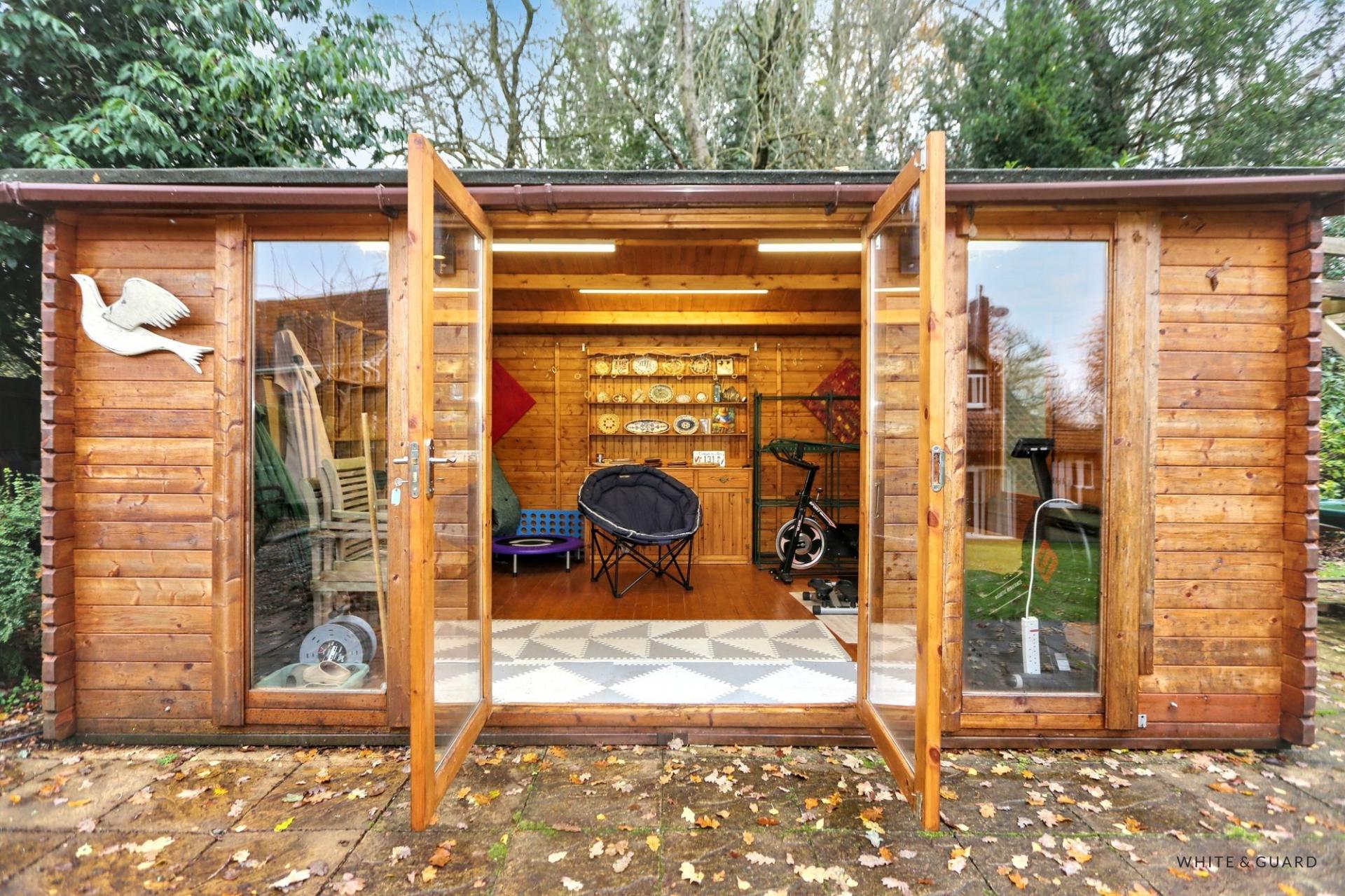 - GOOD SIZE MATURE REAR GARDEN WITH LARGE LOG STUDIO/CABIN