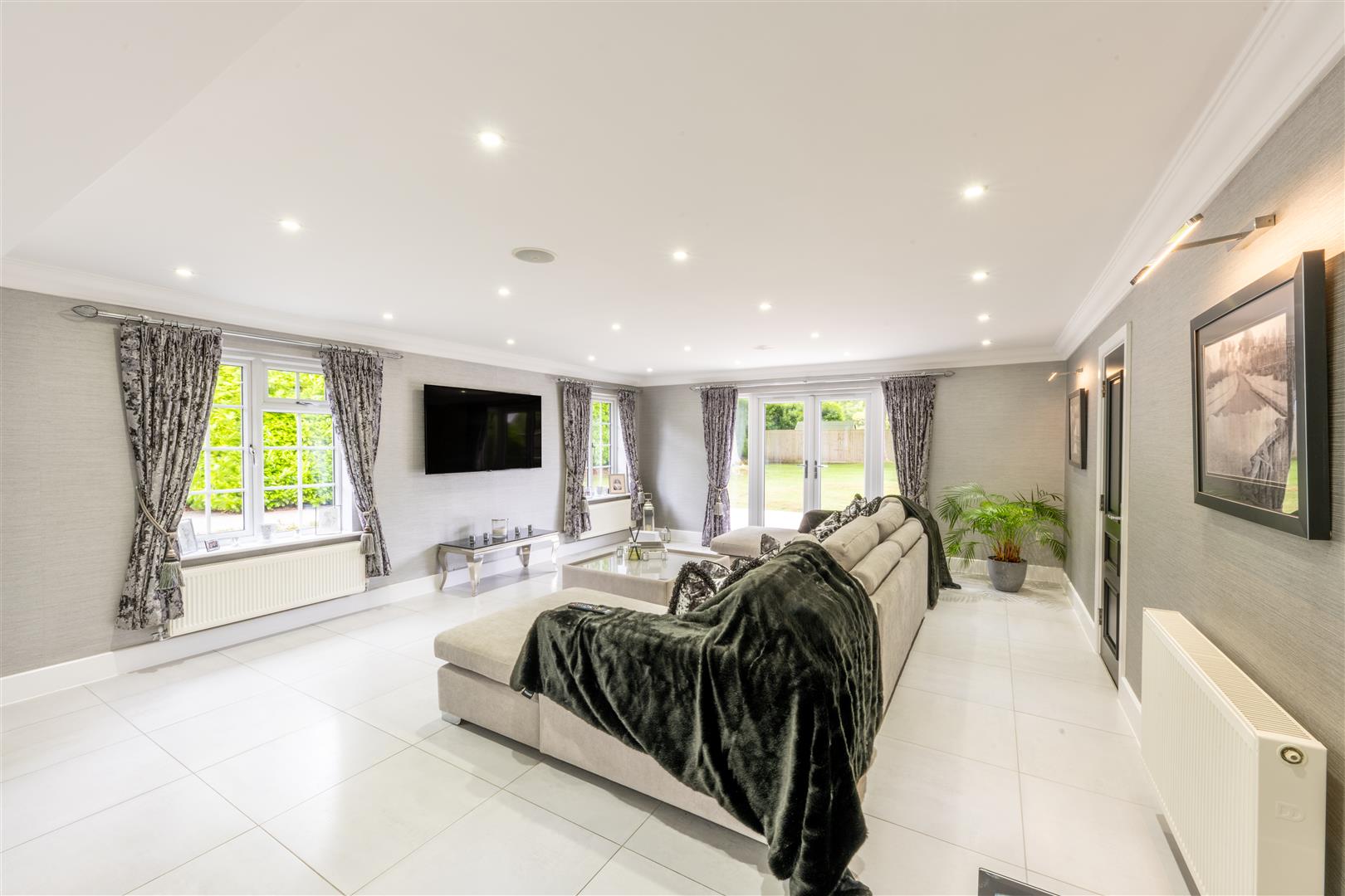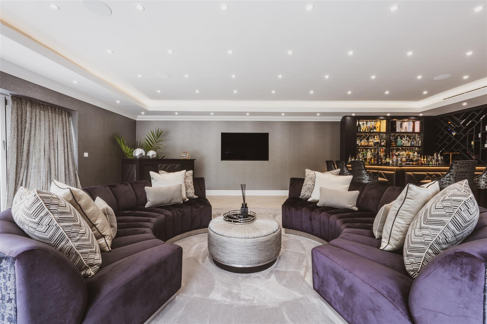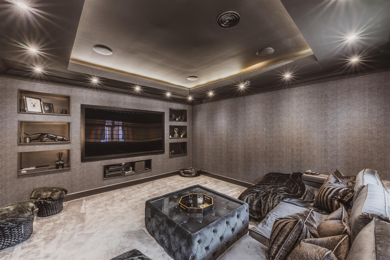 - Home cinema with blackout blinds and a wired in media wall