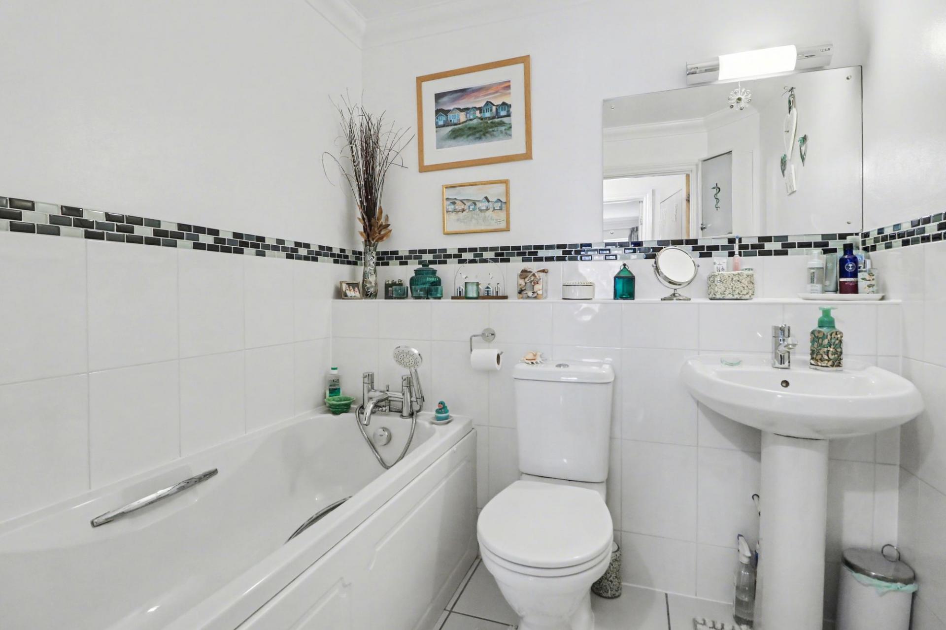 The bathroom has been fitted with a modern suite comprising a panel enclosed bath, wash hand basin and WC.
