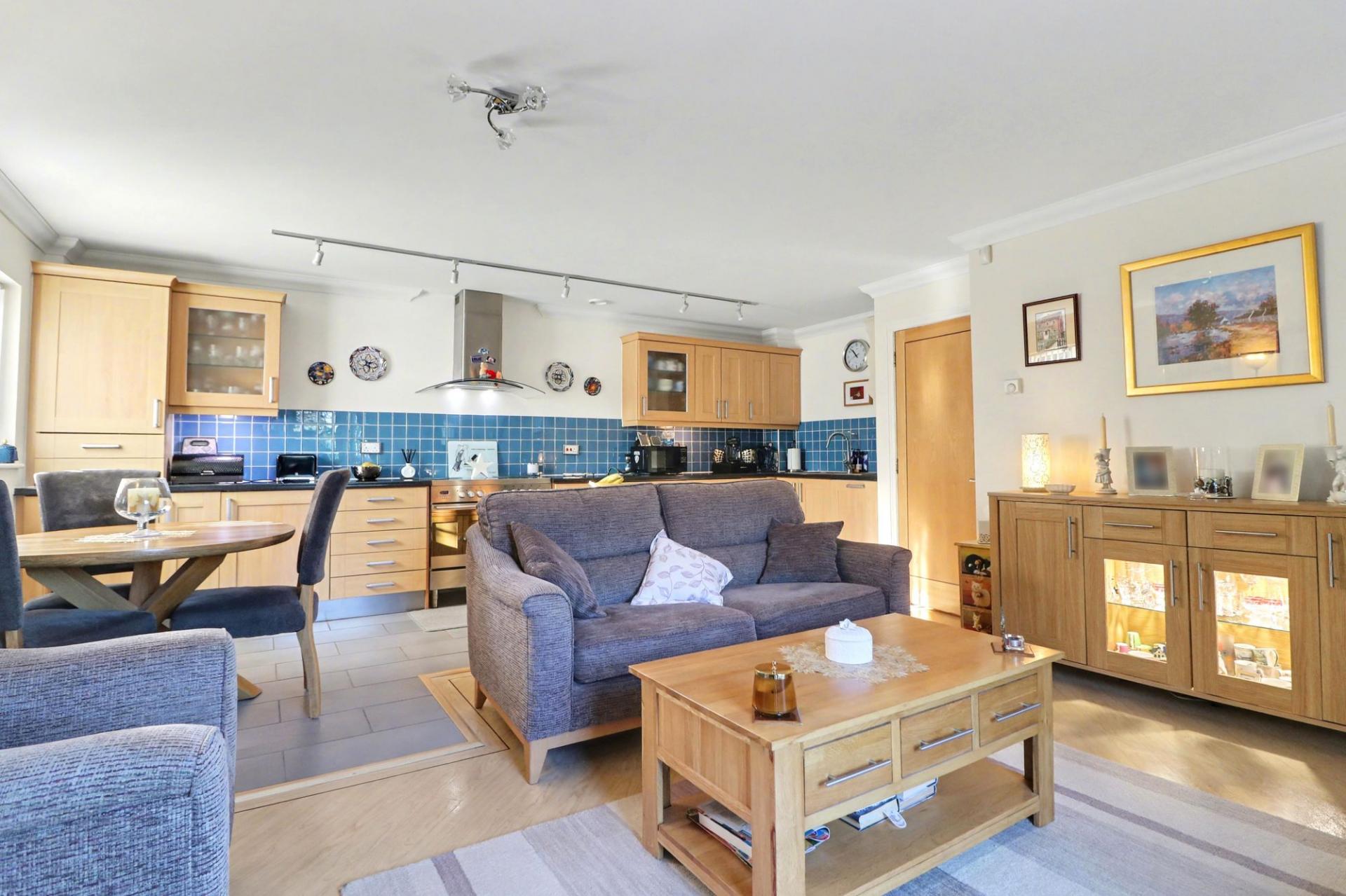 The impressive, kitchen/dining/living area enjoys a dual aspect, offering light and spacious accommodation, with a door leading out to the private patio area. The stylish kitchen has been fitted with a range of wall and base units with a Range style cooker with extractor over and integrated appliances including a fridge, freezer, dishwasher and washer/dryer.