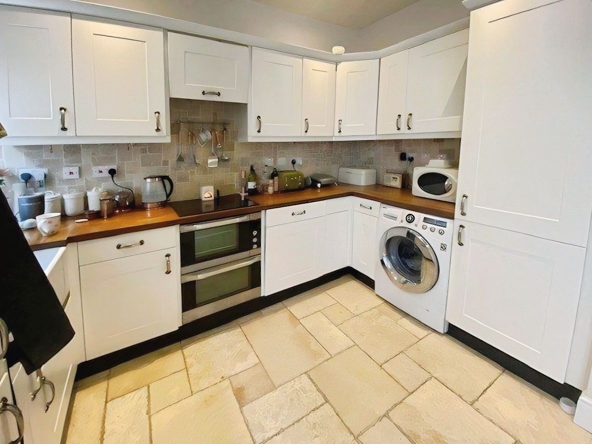 Inside, the home benefits from high ceilings, large windows and an abundance of natural light, creating a bright and airy feel across each floor. The separate living and dining areas provide excellent spaces for both relaxation and entertaining, complemented by stylish wood flooring, tasteful neutral décor and original features such as fireplaces and exposed beams. A modern kitchen with ample storage serves as the heart of the home, while additional practical touches, including under-stairs storage, ensure everyday convenience.