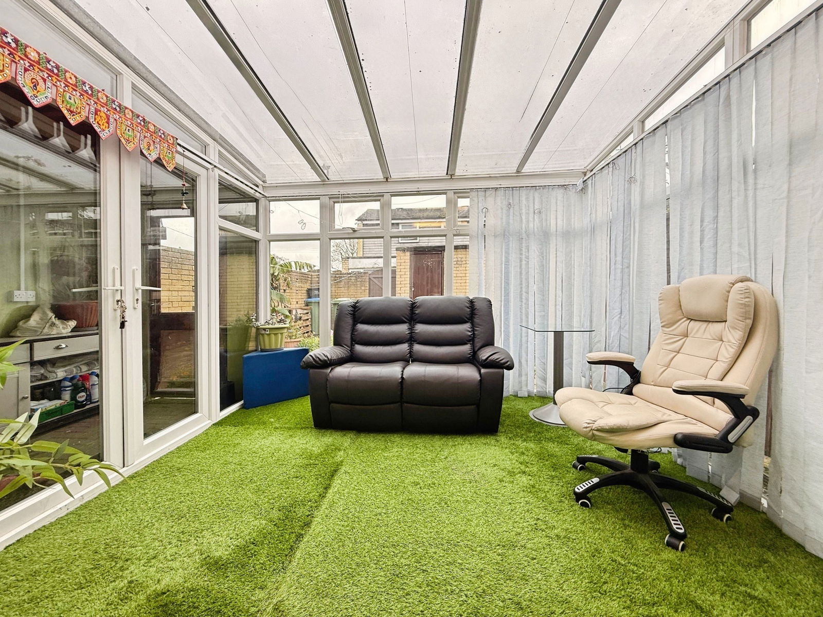 Upon entering, you are greeted by a bright hallway with stylish wood effect vinyl flooring that flows through the ground floor. The ground level features a spacious living room with large windows that allow natural light to flood the space, creating a warm and airy feel. A separate kitchen provides ample storage, generous worktop space, and an easy layout, while an adjoining conservatory expands the living area and provides a relaxing spot overlooking the garden. The ground floor also includes a practical bedroom and a convenient downstairs W/C.