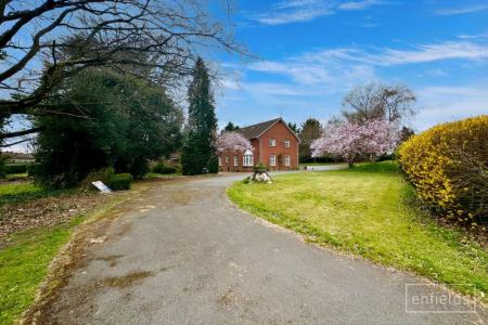 Externally, the property is positioned within generous grounds, with mature trees and open spaces creating a peaceful setting. The site offers ample parking facilities, as well as space for external storage or additional use.