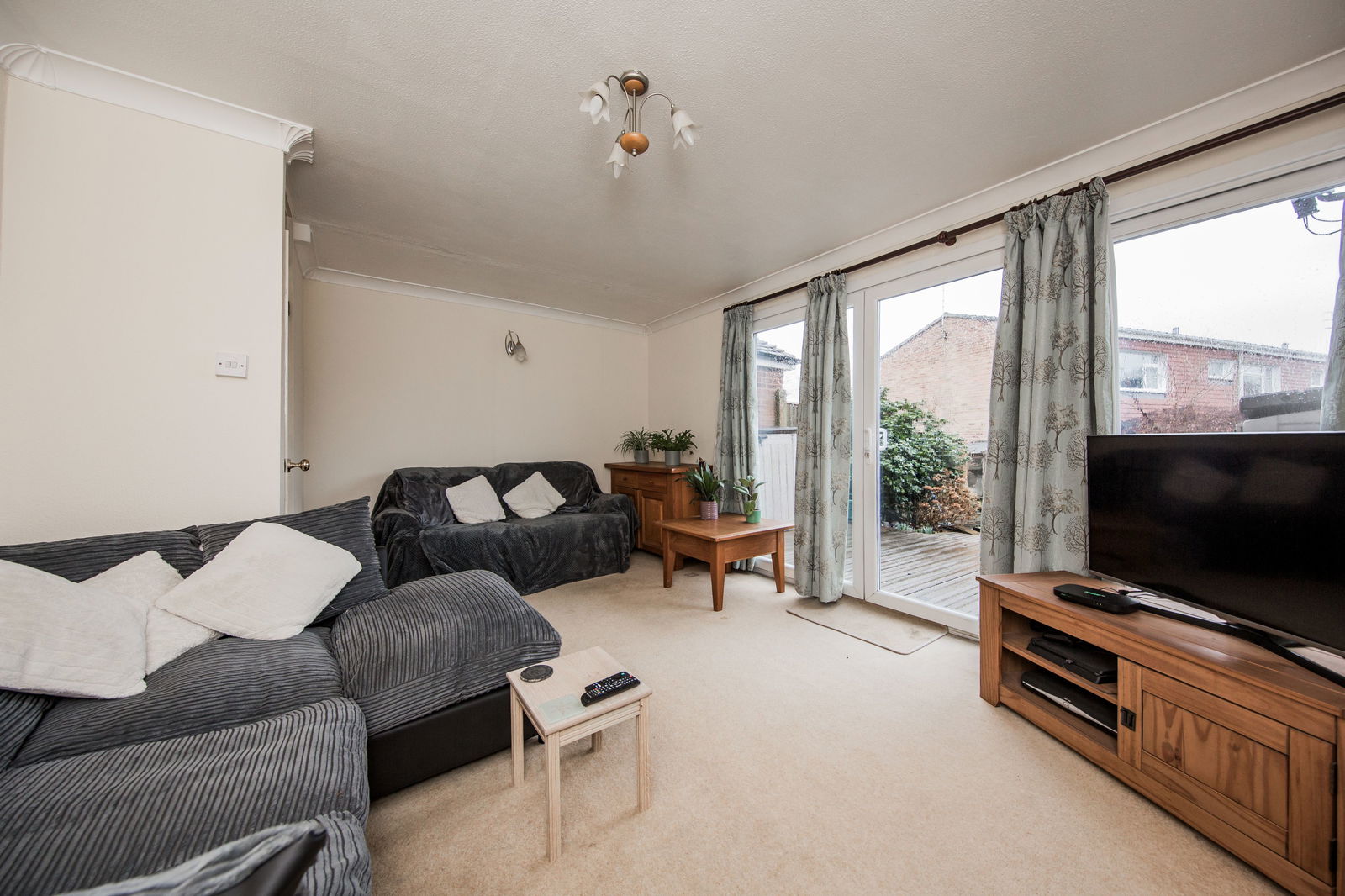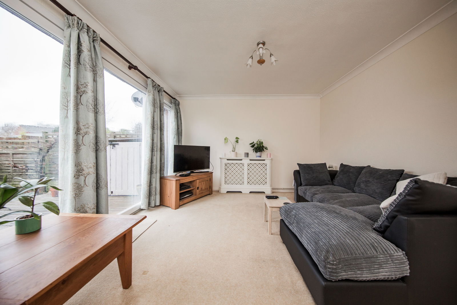 Full width sliding doors to garden, light and airy, space for large sofas, carpeted, radiator.